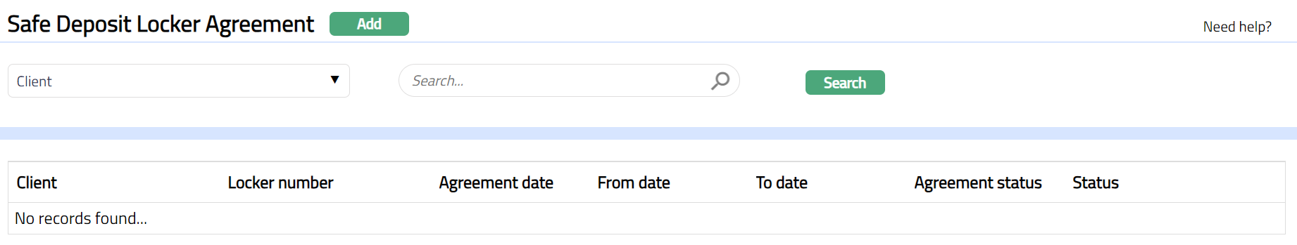 - From Retail menu, click Safe Deposit Locker and then Agreement. Safe Deposit Locker Agreement Search page appears.