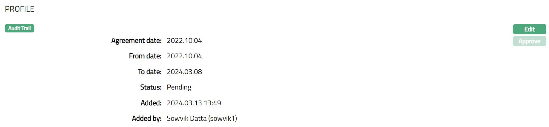 Note: On editing the Profile tab, the status is changed to Pending. Another user with the required rights should approve this record. Note: If the user who added the Status had auto-approval rights, the status of the record will automatically become Approved.