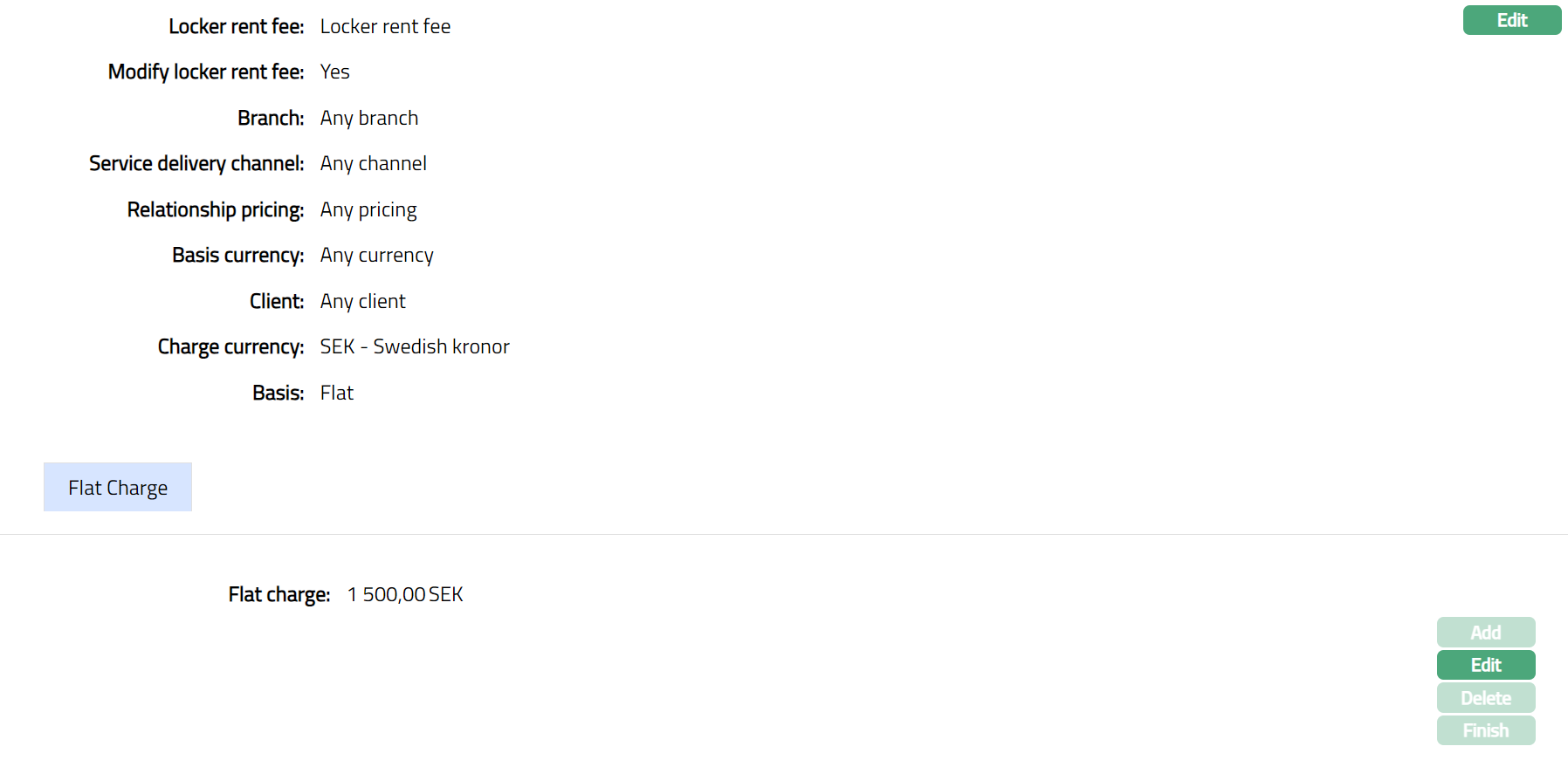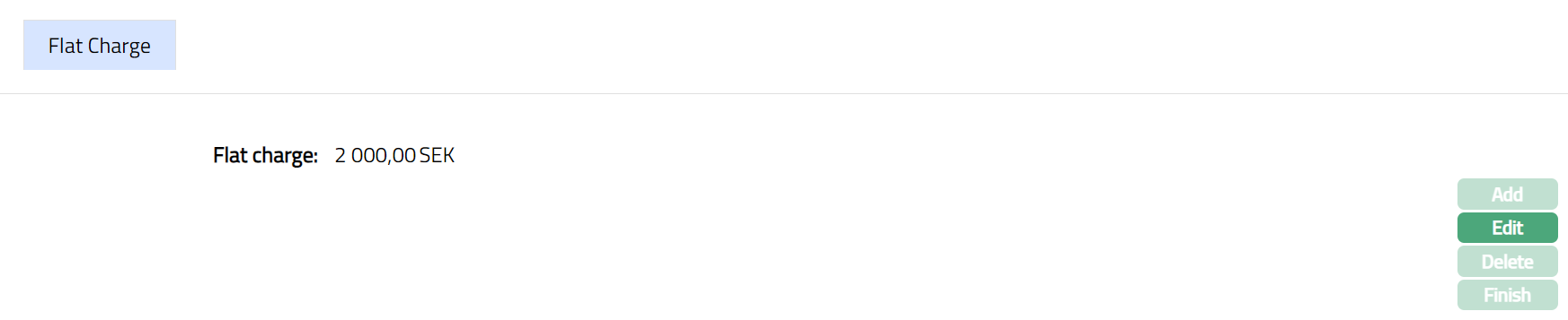 If this is checked (Yes) Add, Edit and Delete buttons will be enabled (only for last band) and you can make changes in the charge scheme parameters. Finish button is always enabled and can be used to close Flat charge page.
