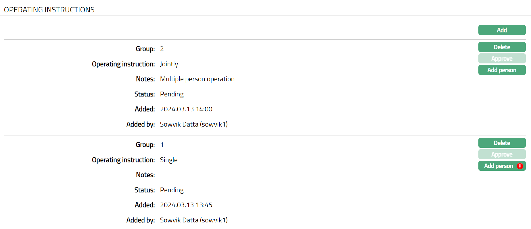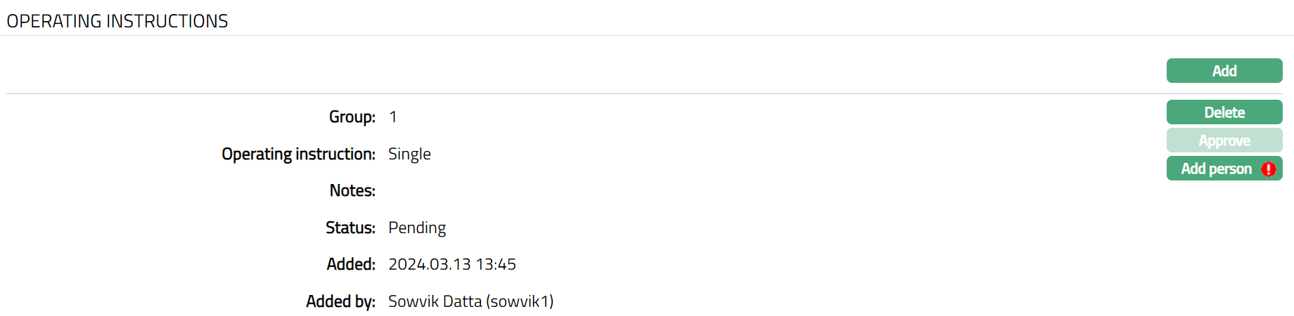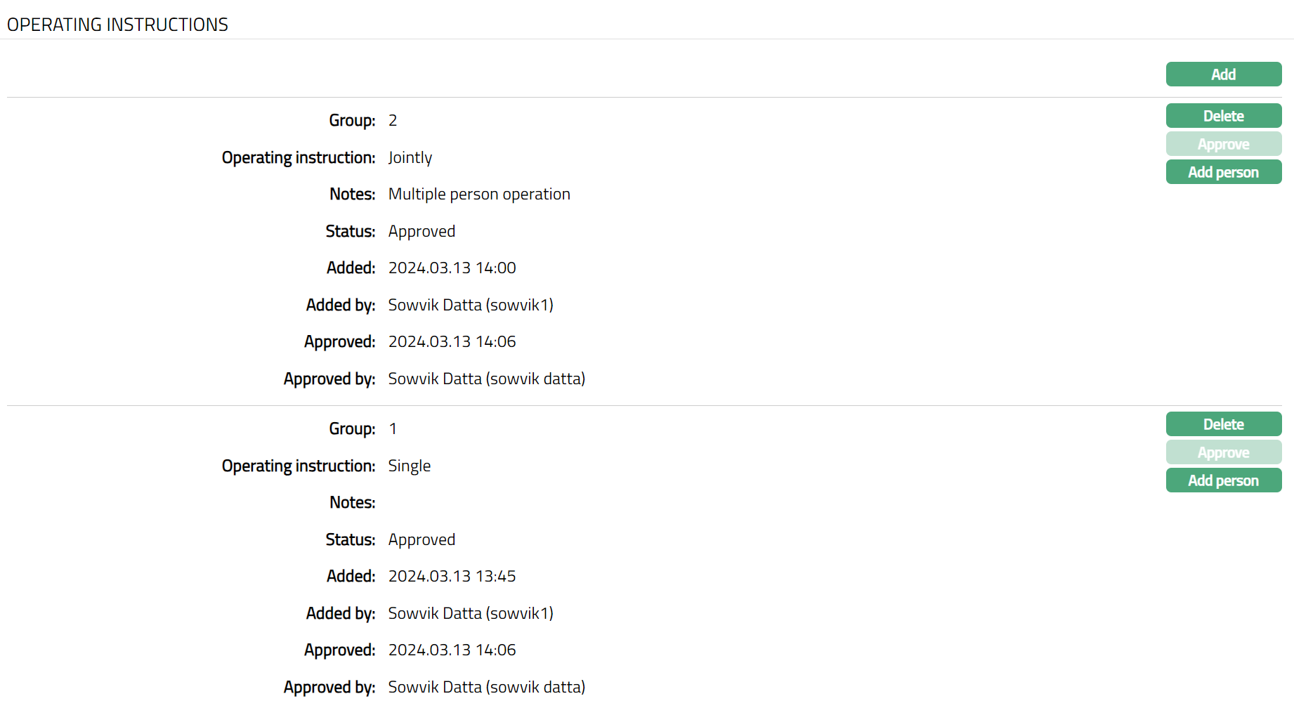 Functions: Add Delete, Approve, Add person.