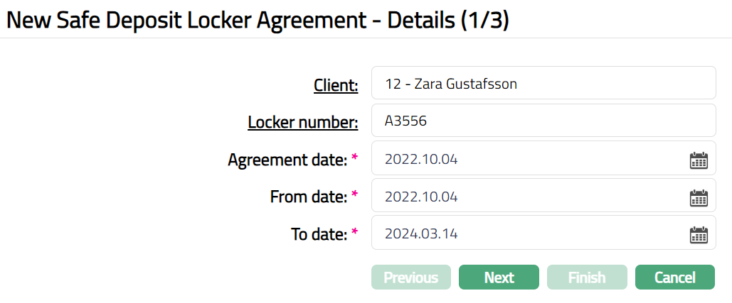 - Click Finish. Safe Deposit Locker Agreement record is created. Safe Deposit Locker Agreement page will appear. The agreement status is Opened -- Record status will be Pending.