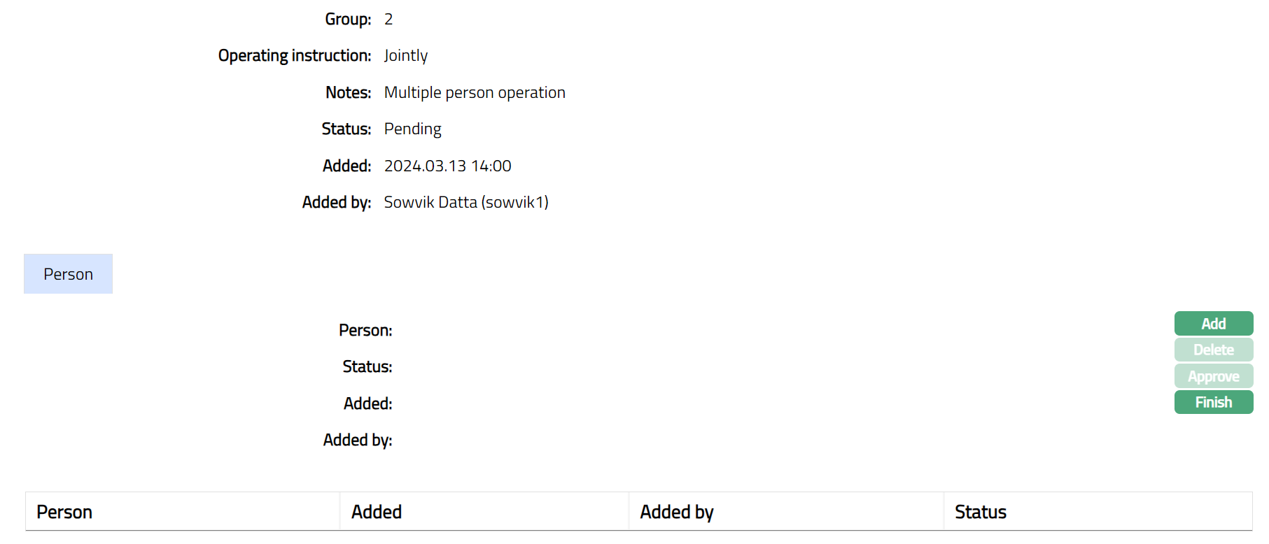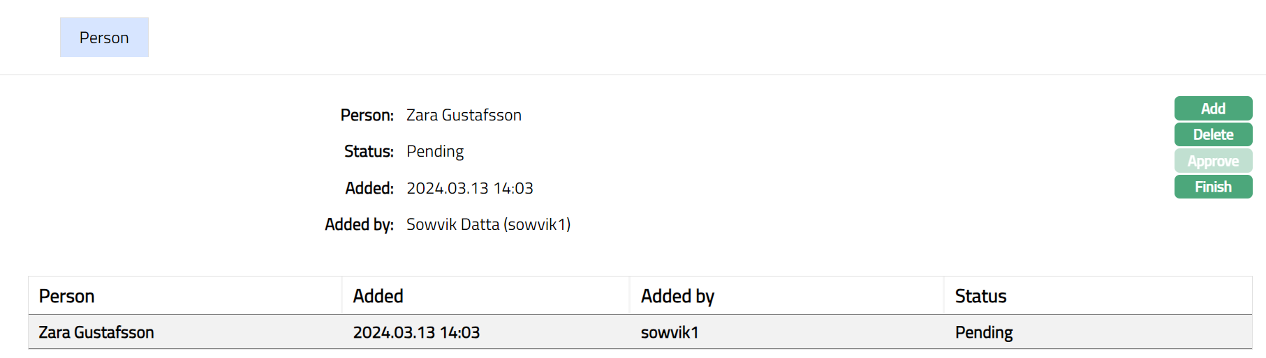 Functions: Add, Delete, Approve, Add Person.