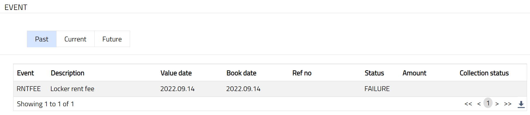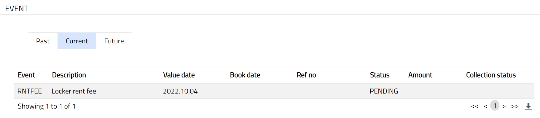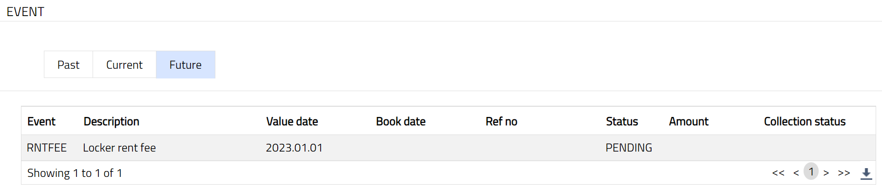 Click Event tab. There are three sub-tabs-- Past, Current and Future. By default, the Current tab is displayed. It shows the details of the Events that have value date = current business date. The Past tab and Future tab show details of events that have value date earlier than / later than the current business date respectively.