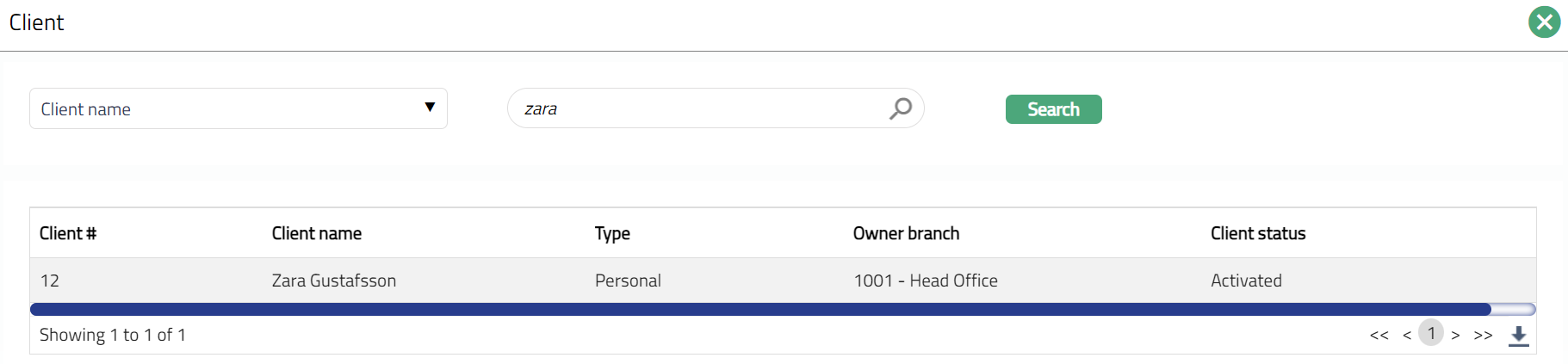 - Select client by clicking Client hyperlink. Client search page appears where you can search for a client with relevant criteria. You can also input the client's name or Client number in the search page and select the required client from the displayed list.