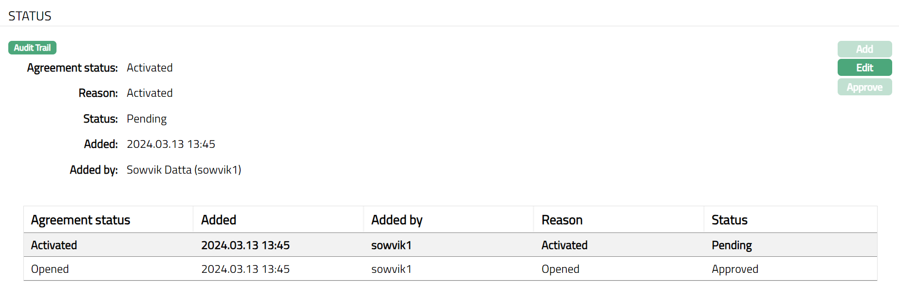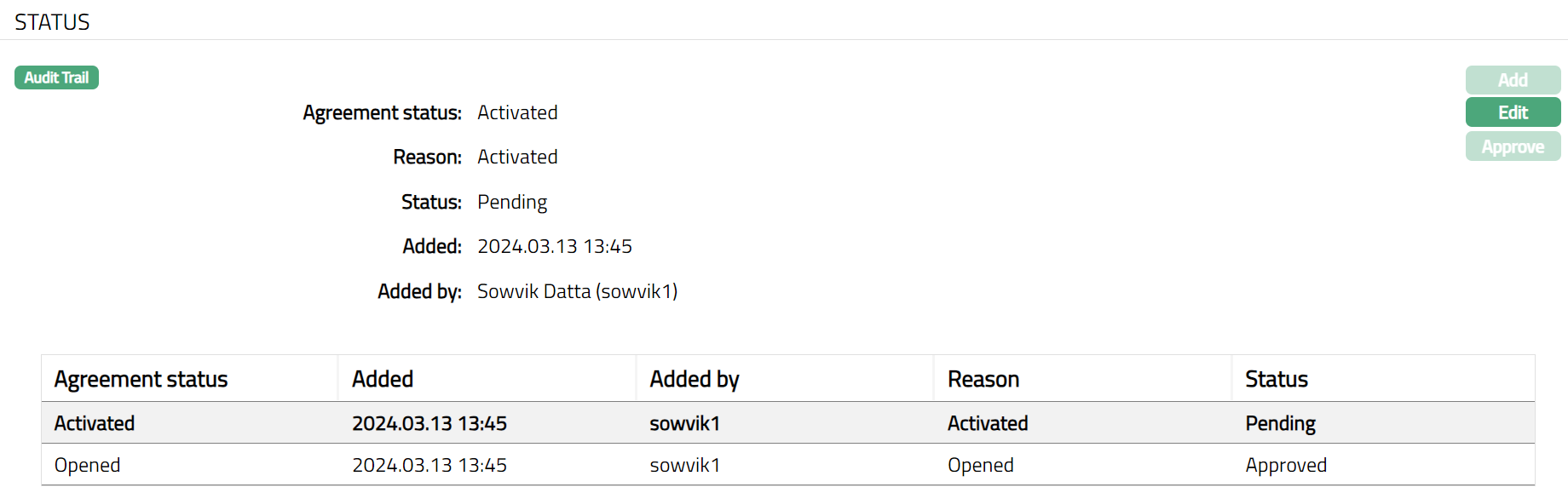 Approve button is enabled when status is Pending and allows the user other than the one who must approve the newly added status.