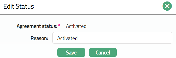 Note: On creation of an agreement, status available in Agreement status drop-down list is Activated. After activation, the statuses available in Agreement status drop-down list are Blocked and Closed.