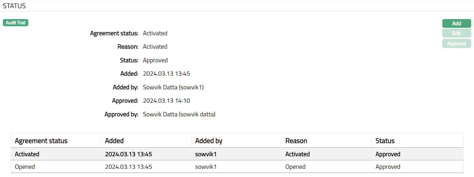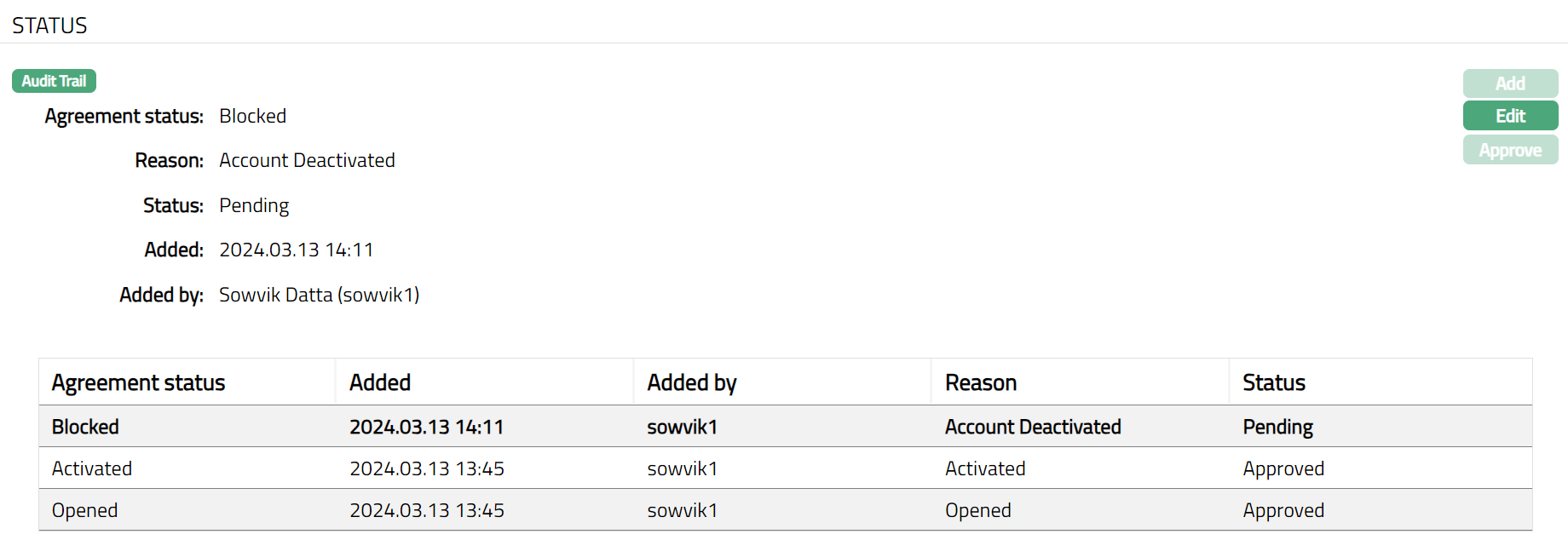 Using this tab you can set agreement status, view the history of the agreement status, as well as approve the status records. On creating a Safe Deposit Locker Agreement Maintenance record, the Agreement status is Opened and Record status is Pending.