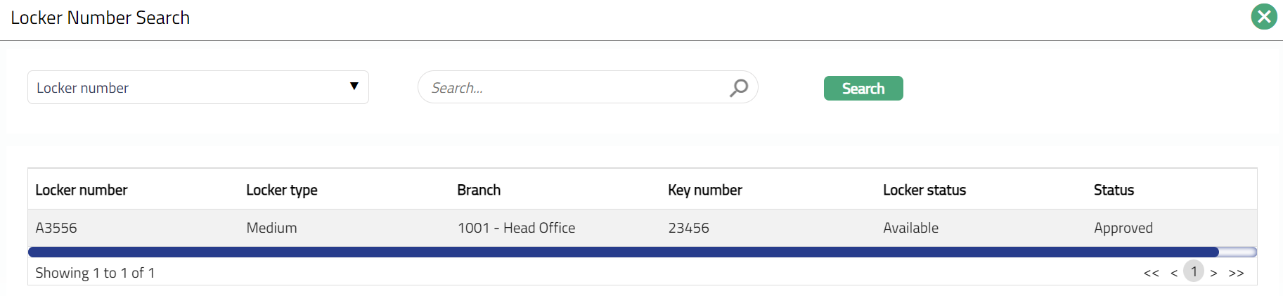 - Select Locker number by clicking Locker number hyperlink. Locker Number Search page appears with the list of all the lockers for which the Safe deposit locker maintenance record is maintained under Retail > Safe deposit lockers > Maintain and the locker status is Available and record status is Approved.