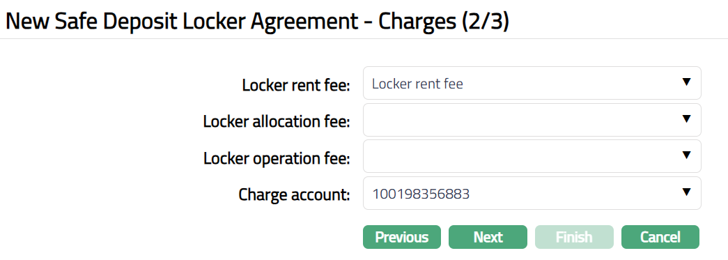 Click Next. New Safe Deposit Locker Agreement -- Charges (2/3) page appears.