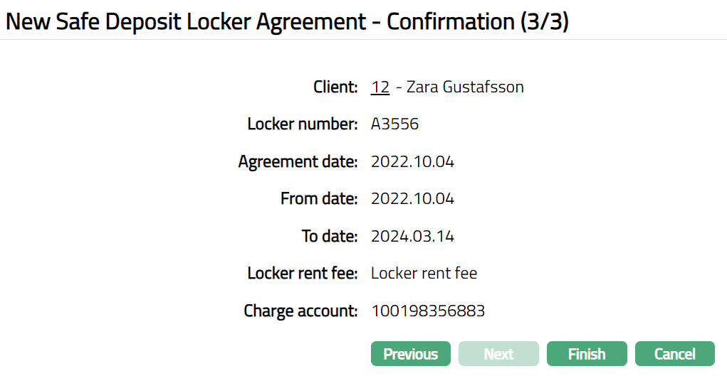 - Click Next. New Safe Deposit Locker Agreement -- Confirmation (3/3) appears.