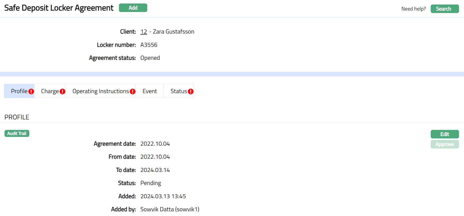 Profile tab, which is the default tab in the Safe Deposit Locker Agreement page shows the basic details of the Safe Deposit Locker Agreement. The default status of the tab is Pending, and the status can be changed to Activated on Approval. Any user other than the one who has created the record can approve the profile tab.