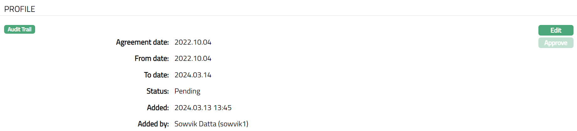 Note: Any change in the tab will set the status to Pending till it is approved by another user who has not created this record. On approval, the tab status is set to Approved. If the status is pending, the Edit button also gets enabled.