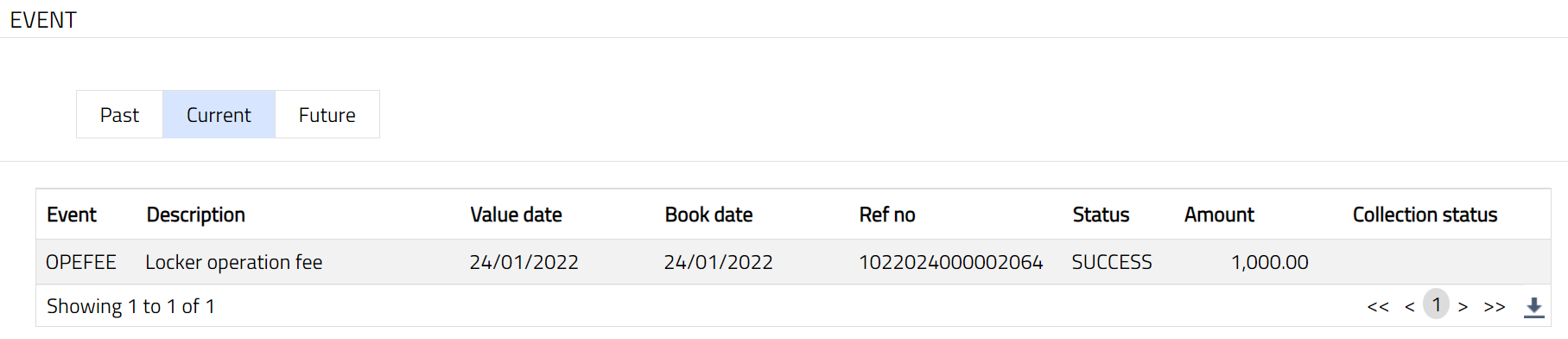 Click Event tab. There are three sub-tabs within it -- Past, Current and Future. By default, Current tab is displayed. It shows the details of the Events that have value date = current business date. Past tab and Future tab show details of events that have value date earlier than / later than the current business date respectively if available.