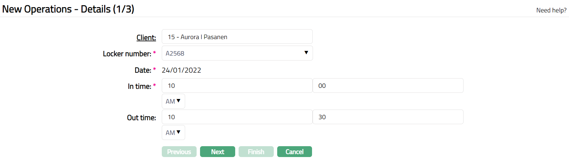 Safe deposit locker -- Operations allows you to maintain the operations on the locker. You can create or update a record with details like Client name, Date of operation, In time, Out time against a particular locker number.