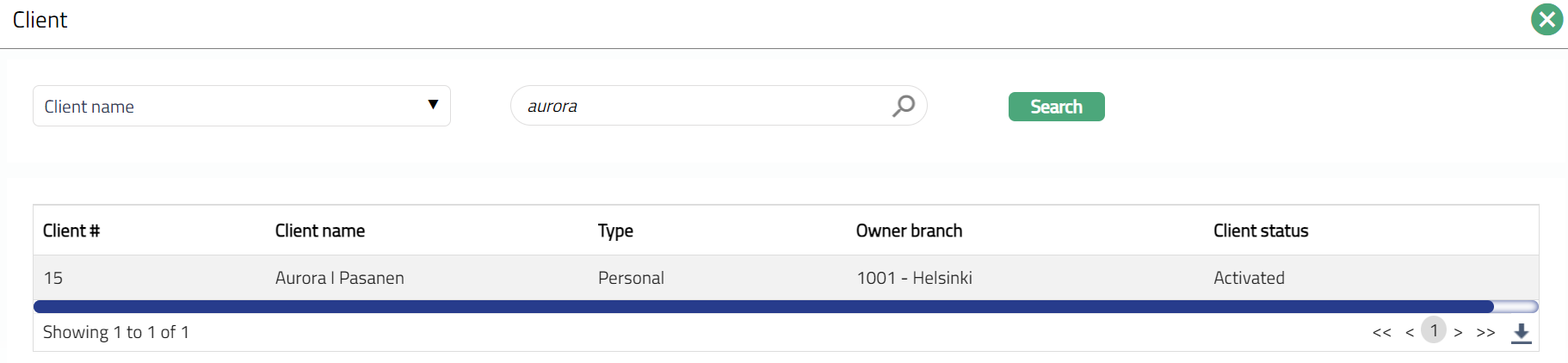 - Select client by clicking Client hyperlink. Client search page appears where you can search for a client with relevant criteria. You can also input the client's name or client number on the search page. Select the required client from the list displayed.