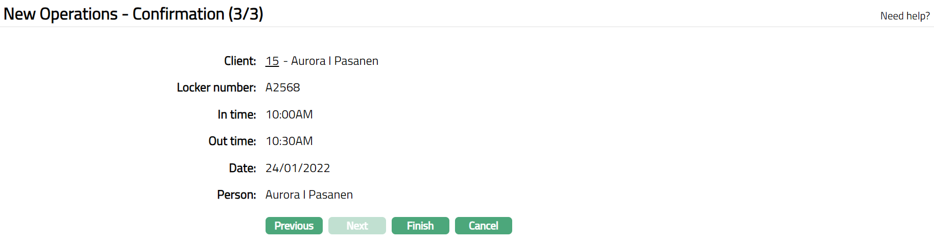 Note: On Click of Finish, the locker operation maintenance record is created and can be seen in the Operations tab. The summary of the locker operations is also saved under Safe deposit locker maintenance > History > Operations.
