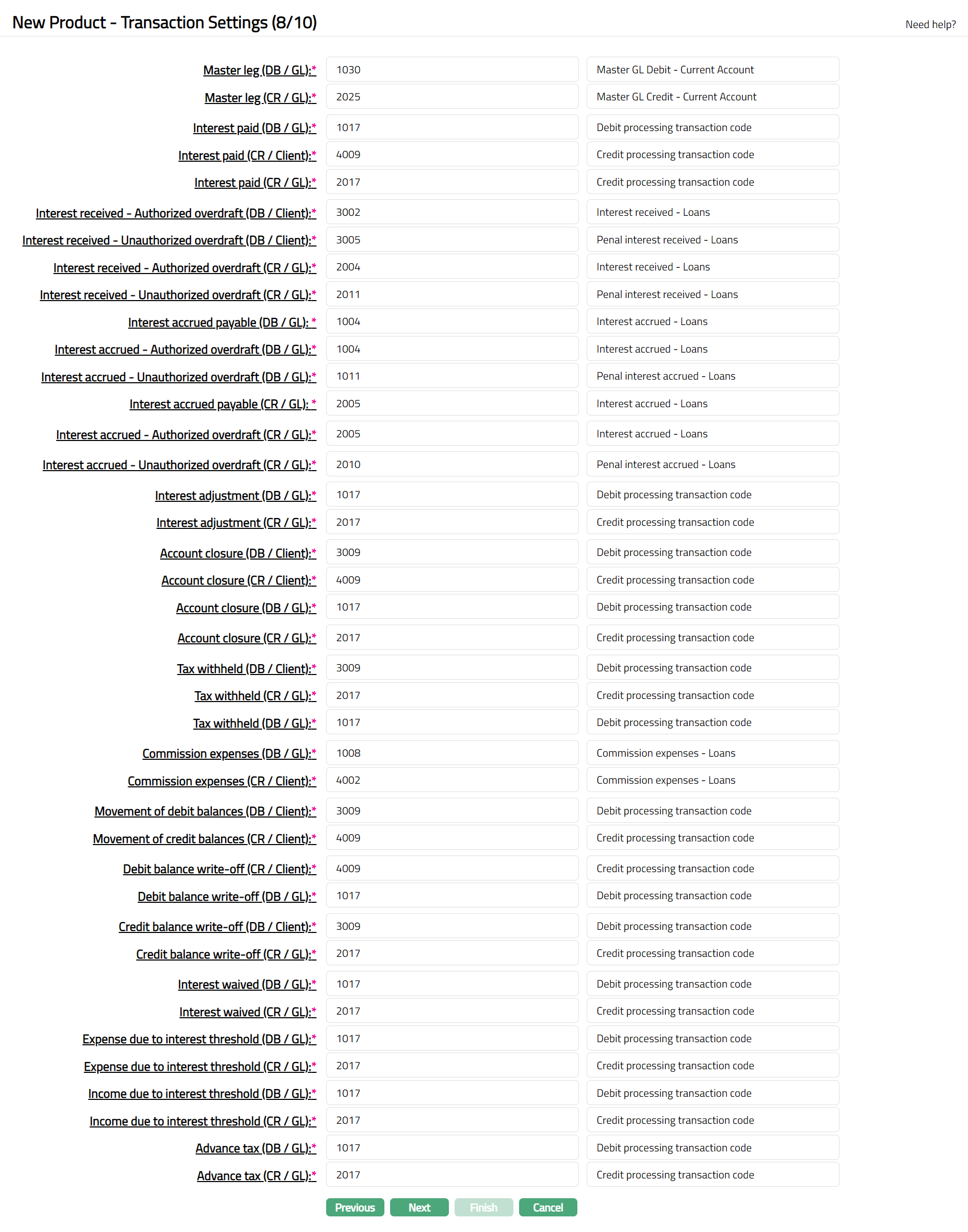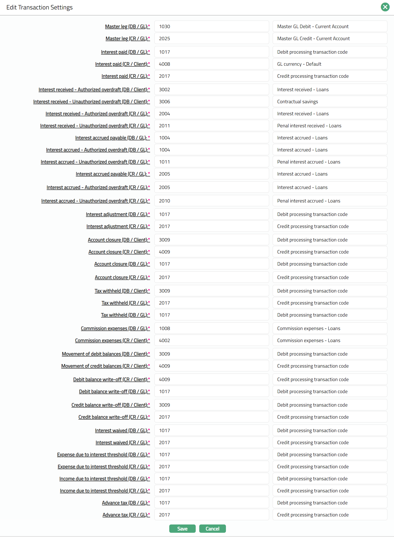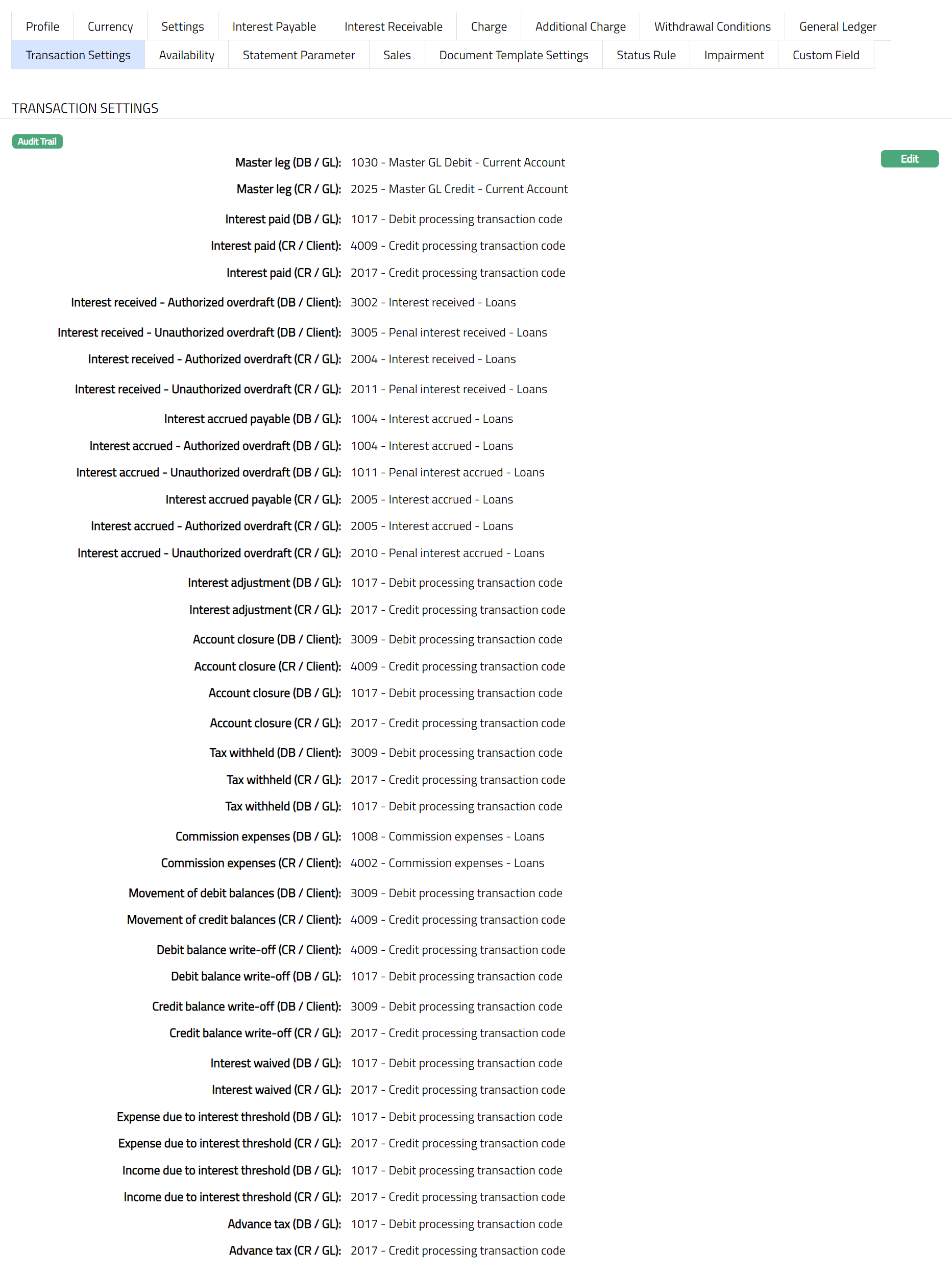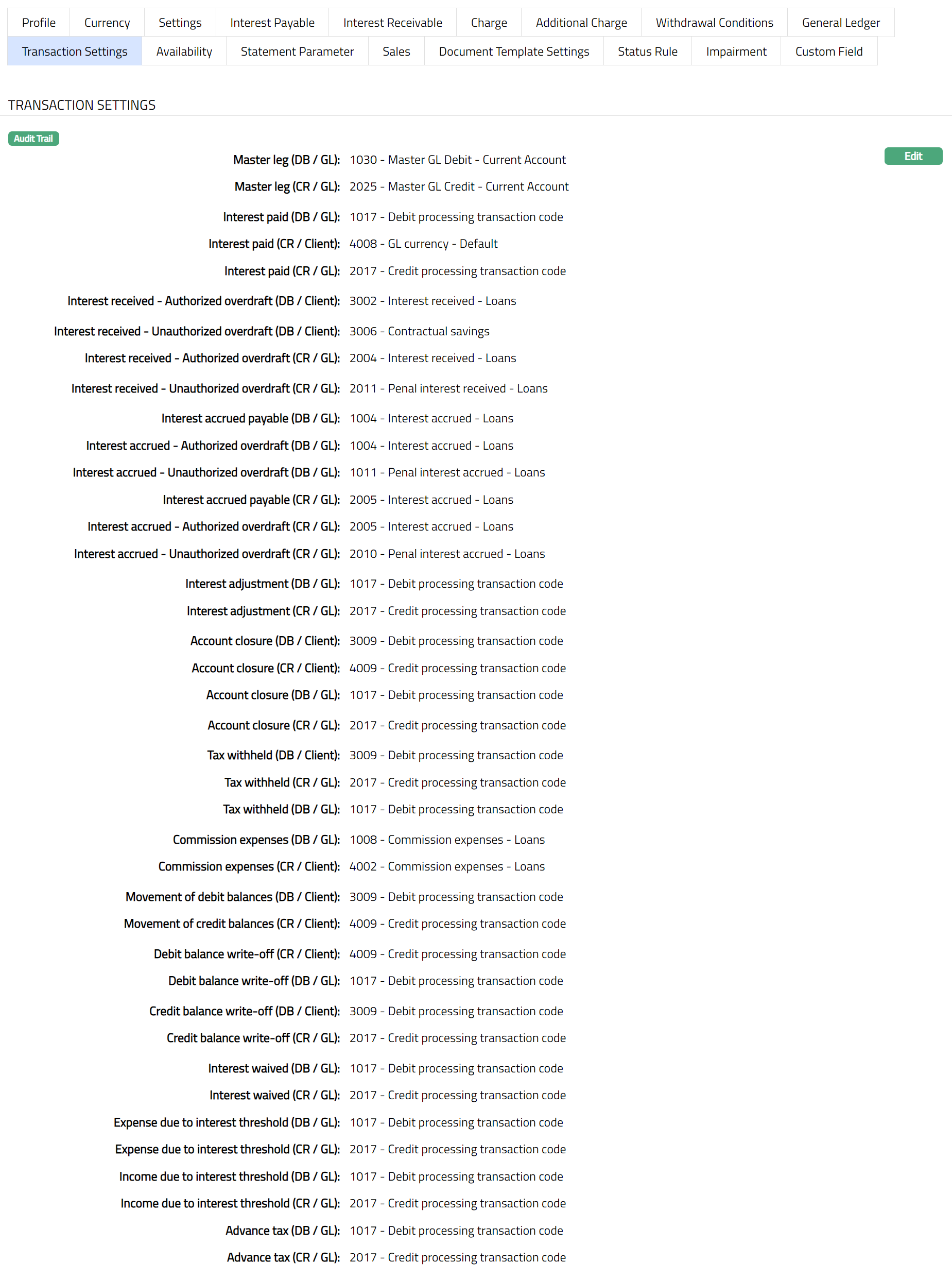 Transaction settings tab allows you to specify the transaction codes that are to be used for the various events in the life cycle of the Product. These transaction codes define what description / narration is used for the account postings / statements and may also be used to trigger other charges.