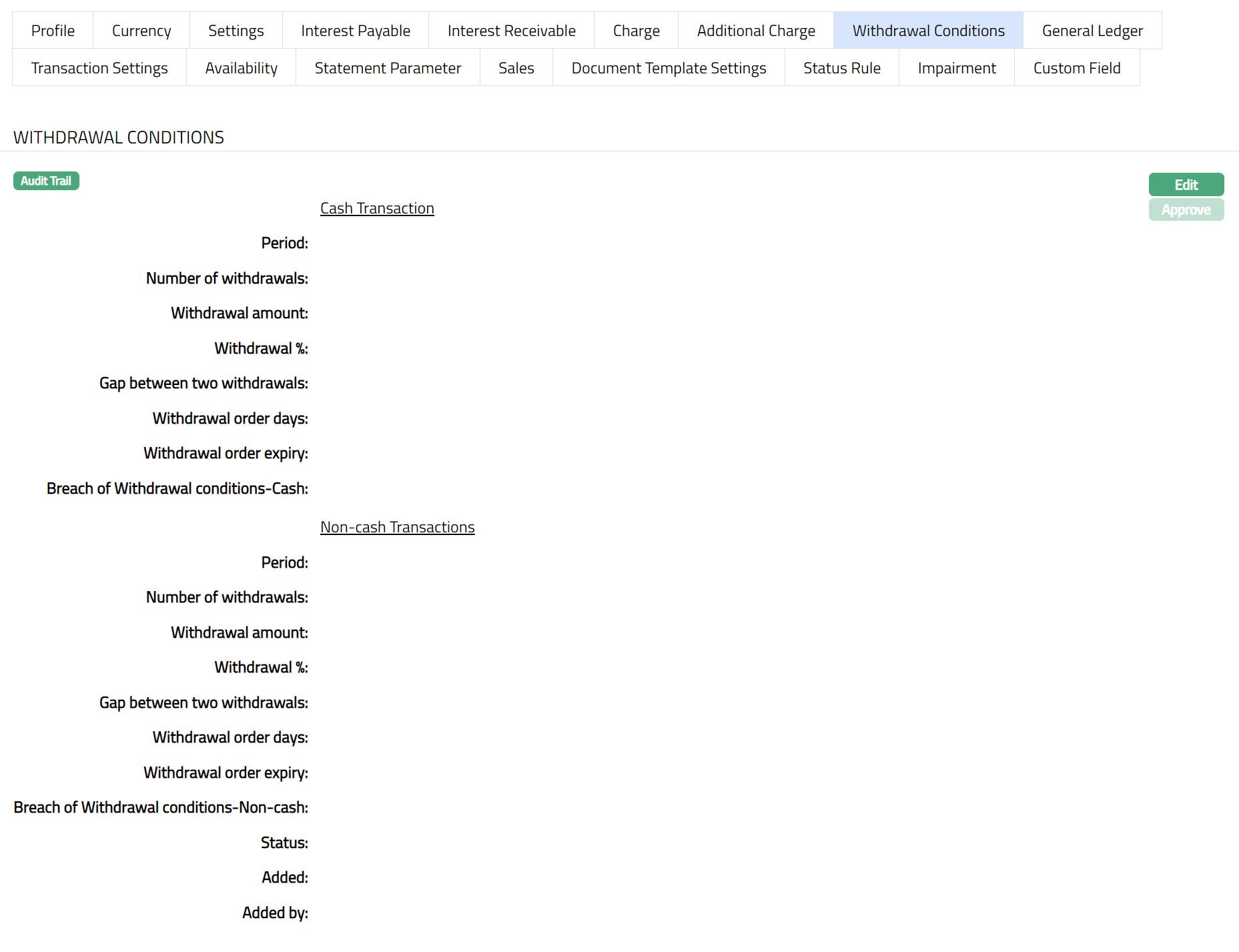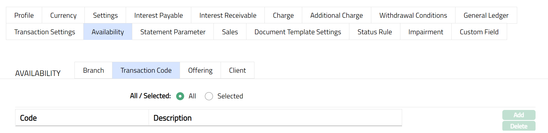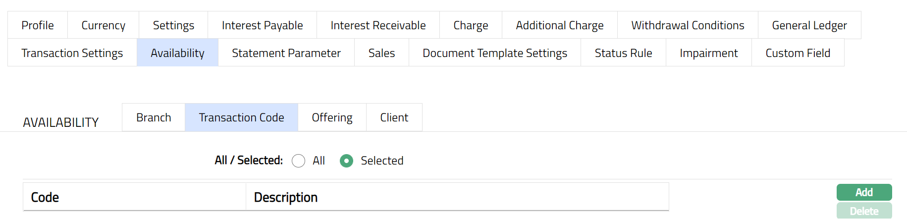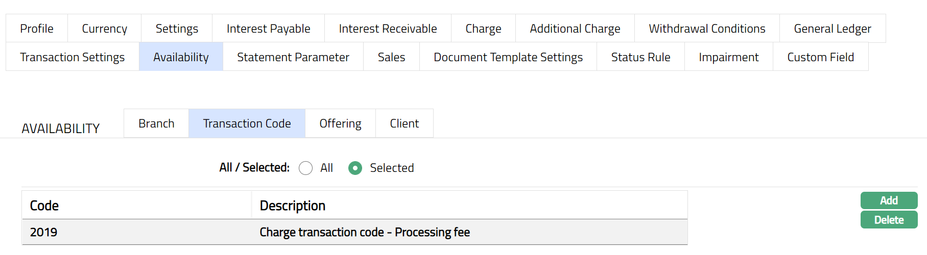 Transaction settings tab allows you to specify the transaction codes that are to be used for the various events in the life cycle of the Product. These transaction codes define what description / narration is used for the account postings / statements and may also be used to trigger other charges.