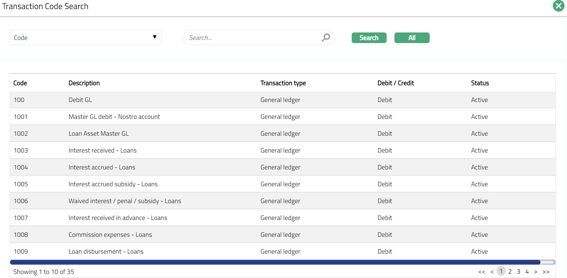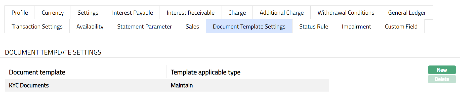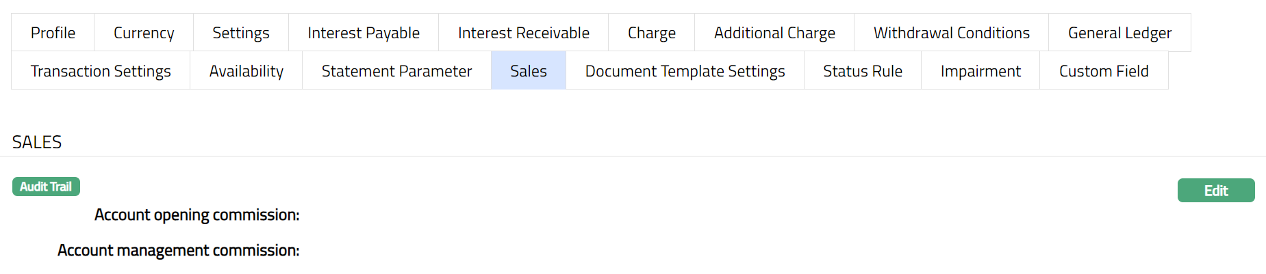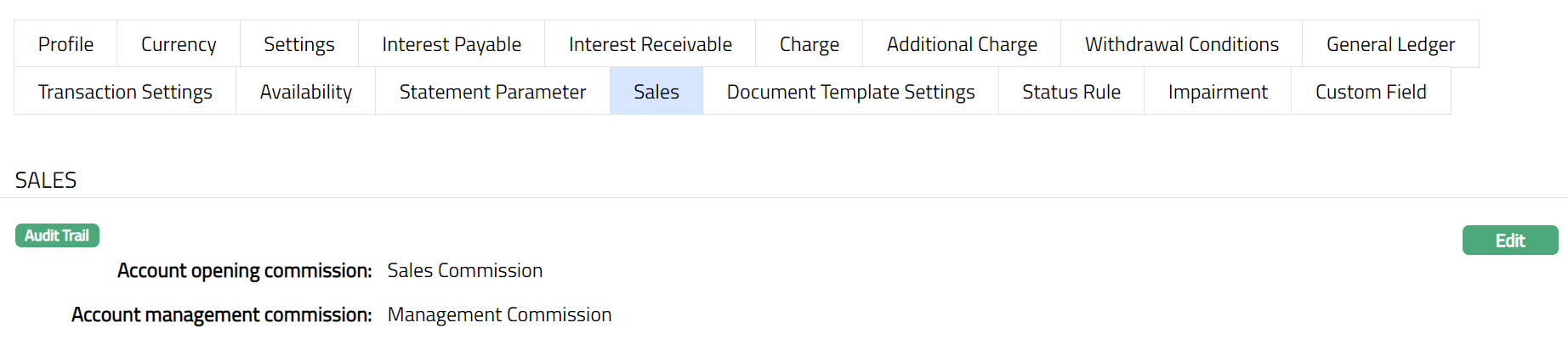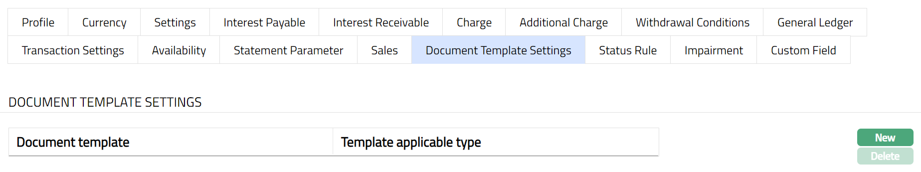 Transaction settings tab allows you to specify the transaction codes that are to be used for the various events in the life cycle of the Product. These transaction codes define what description / narration is used for the account postings / statements and may also be used to trigger other charges.