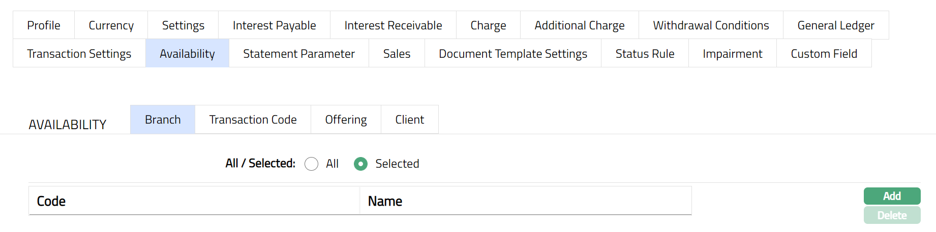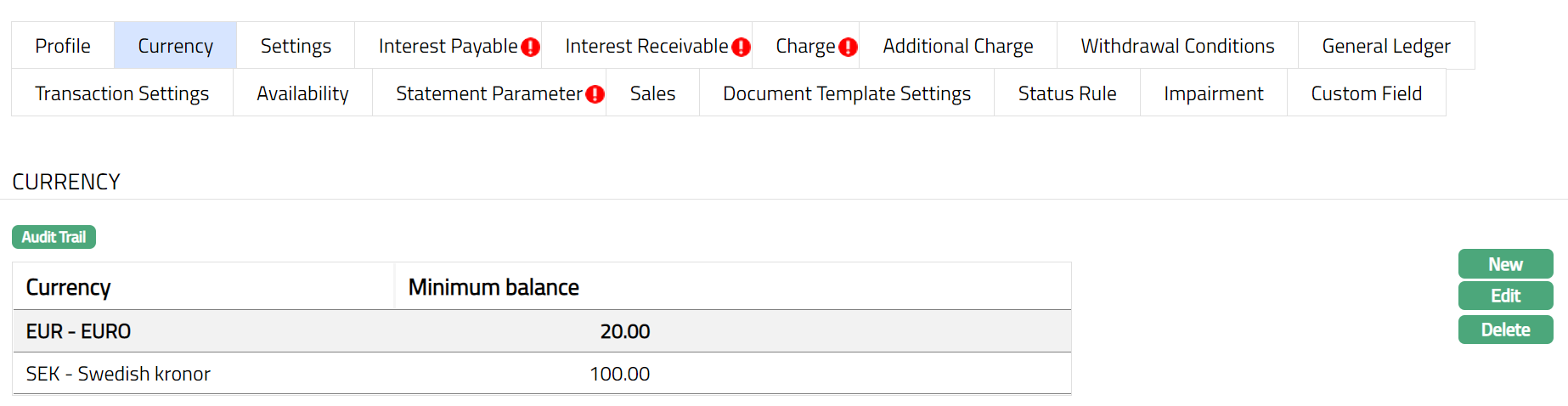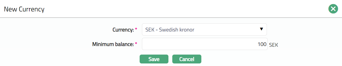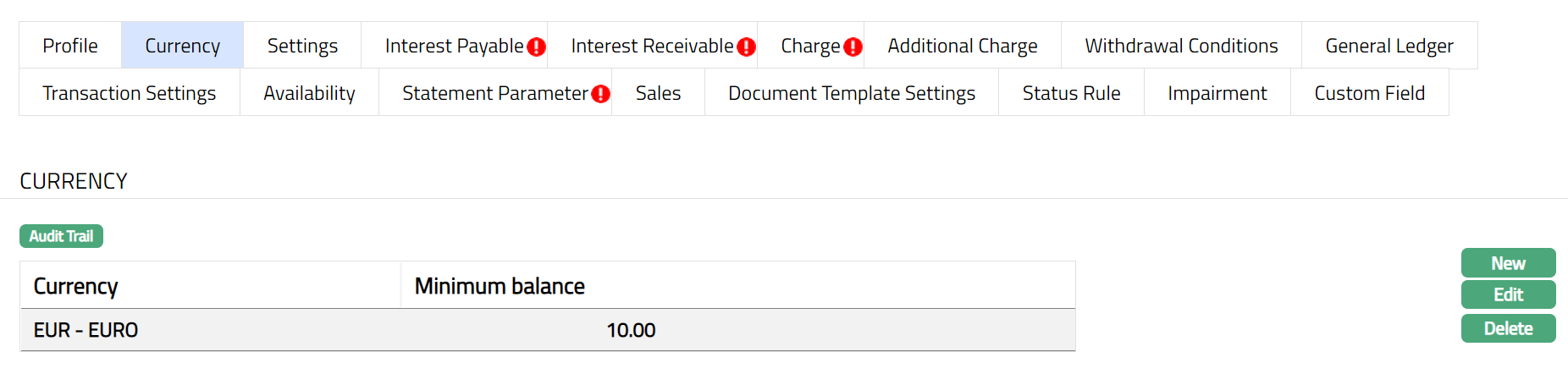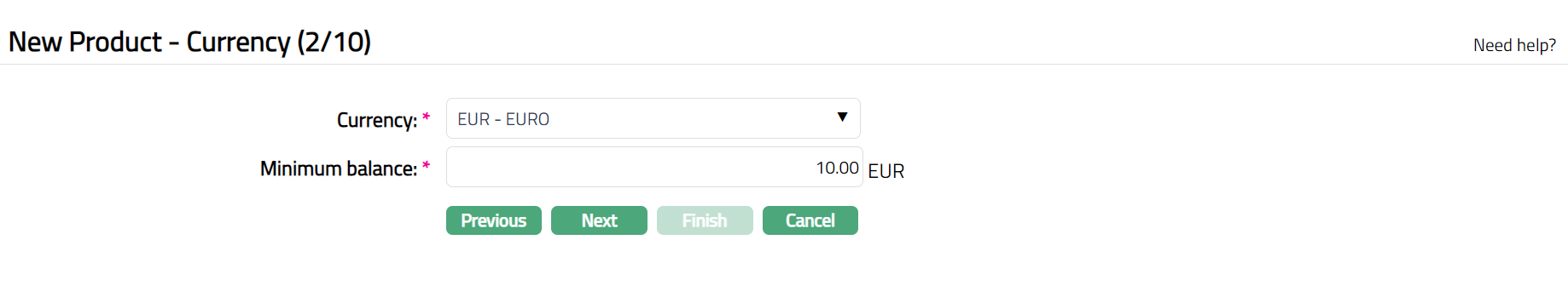 Select the Currency for the Product from the dropdown list of GL Currencies. More currencies can be added during Edit using the Currency tab, once the product record is created. Accounts for the product can be opened only in the selected currencies.