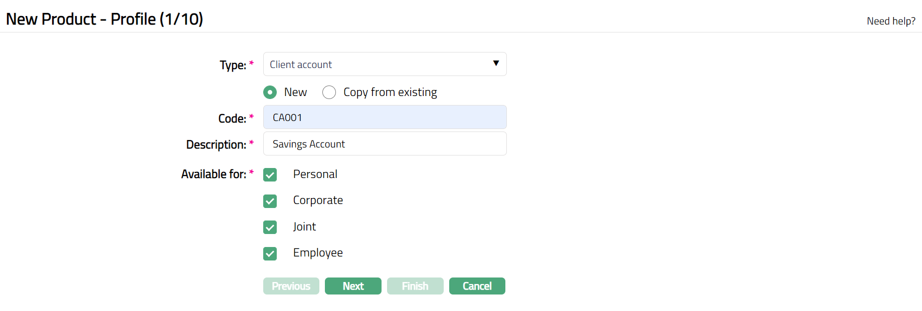 Aura allows you to create a new loan product or create a Client account product based on the existing Client account products in the Aura.