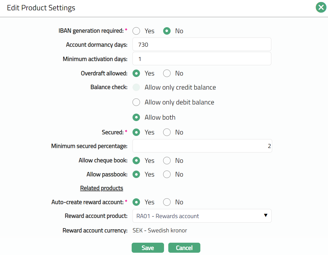 Select Yes or No radio button for Secured field to specify if the security has to attached for the accounts created based on this product. If this has been selected as Yes, Minimum Secured Percentage will be enabled.