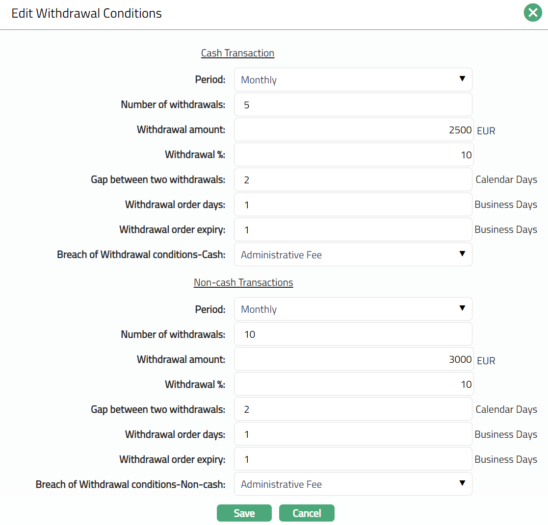 Note: The amount entered in Minimum interest to be paid and Maximum interest to be paid belongs to the currency chosen in Currency field, and the number of decimals will also depend on the same.