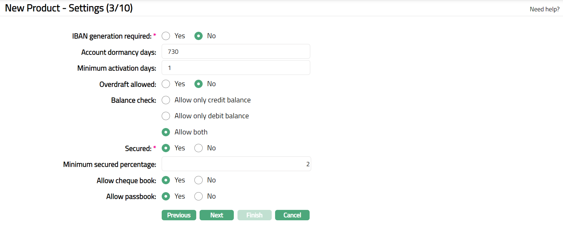 Click Yes or No radio button for Overdraft allowed for the product. Only when Yes is chosen, overdraft will be allowed for accounts under this product.