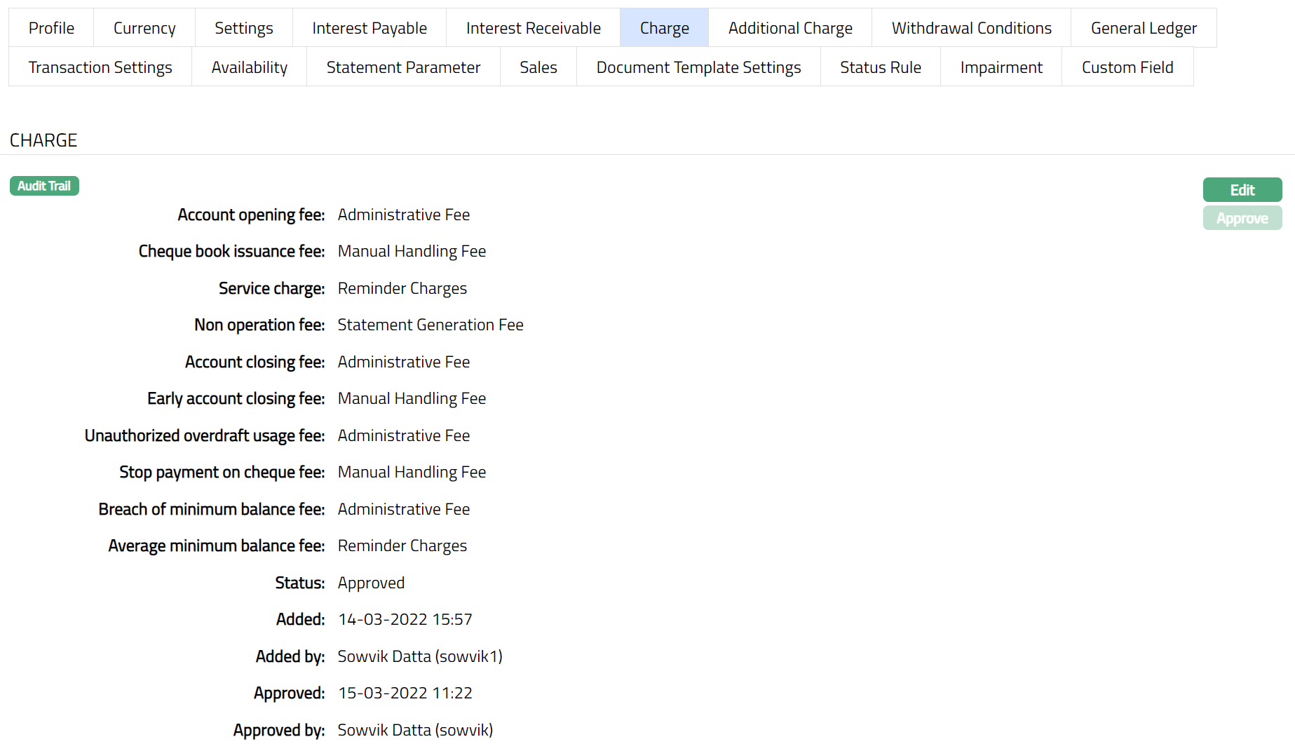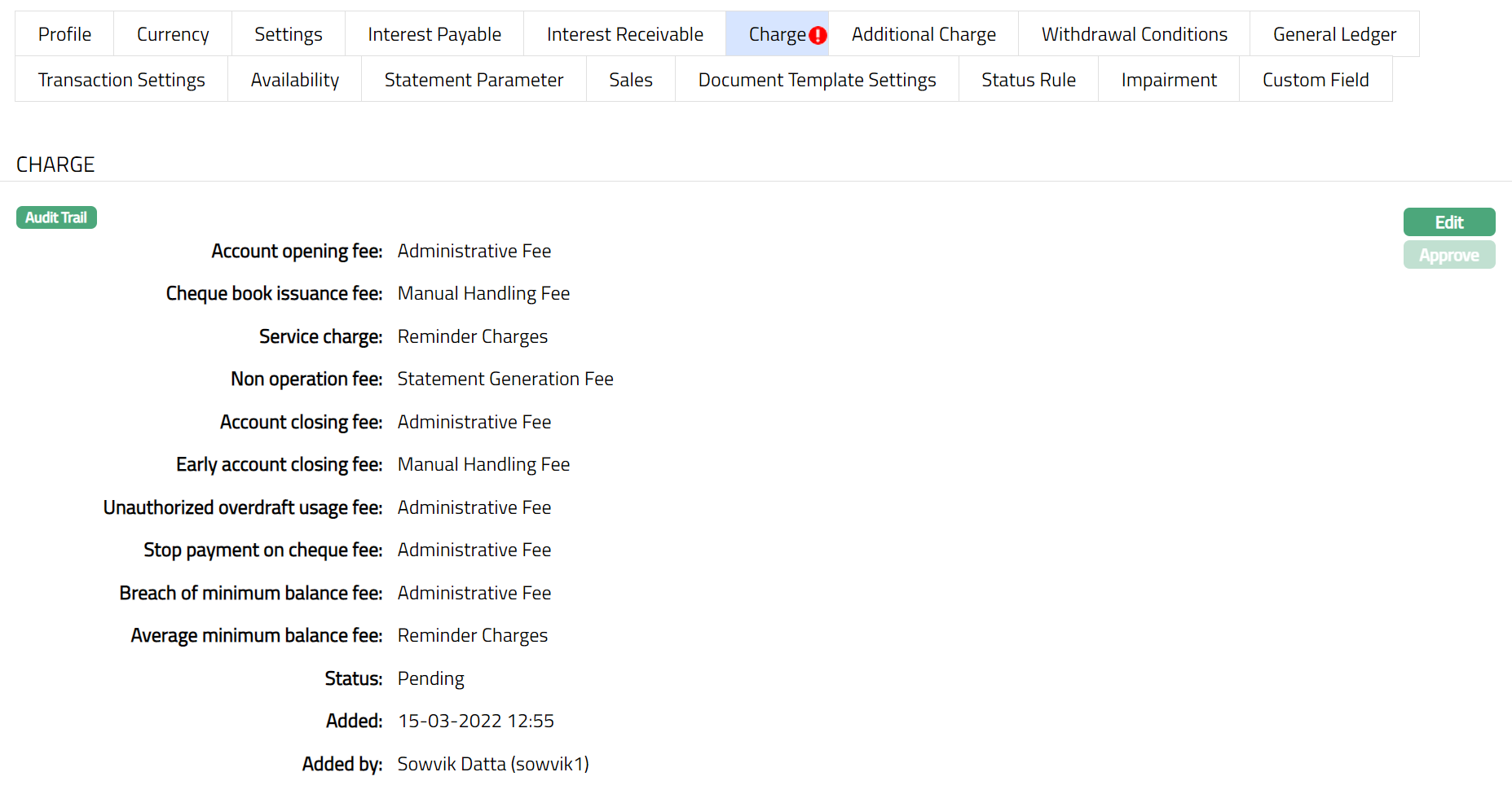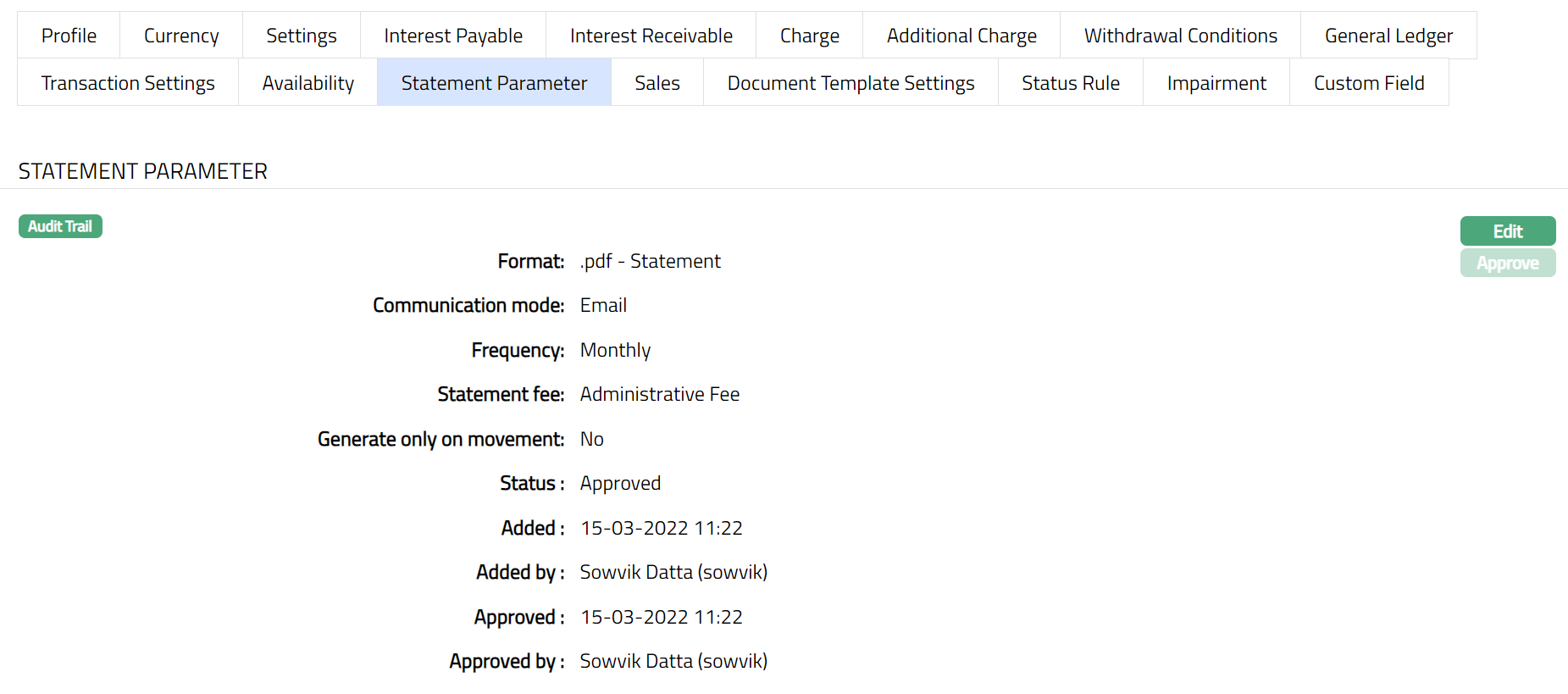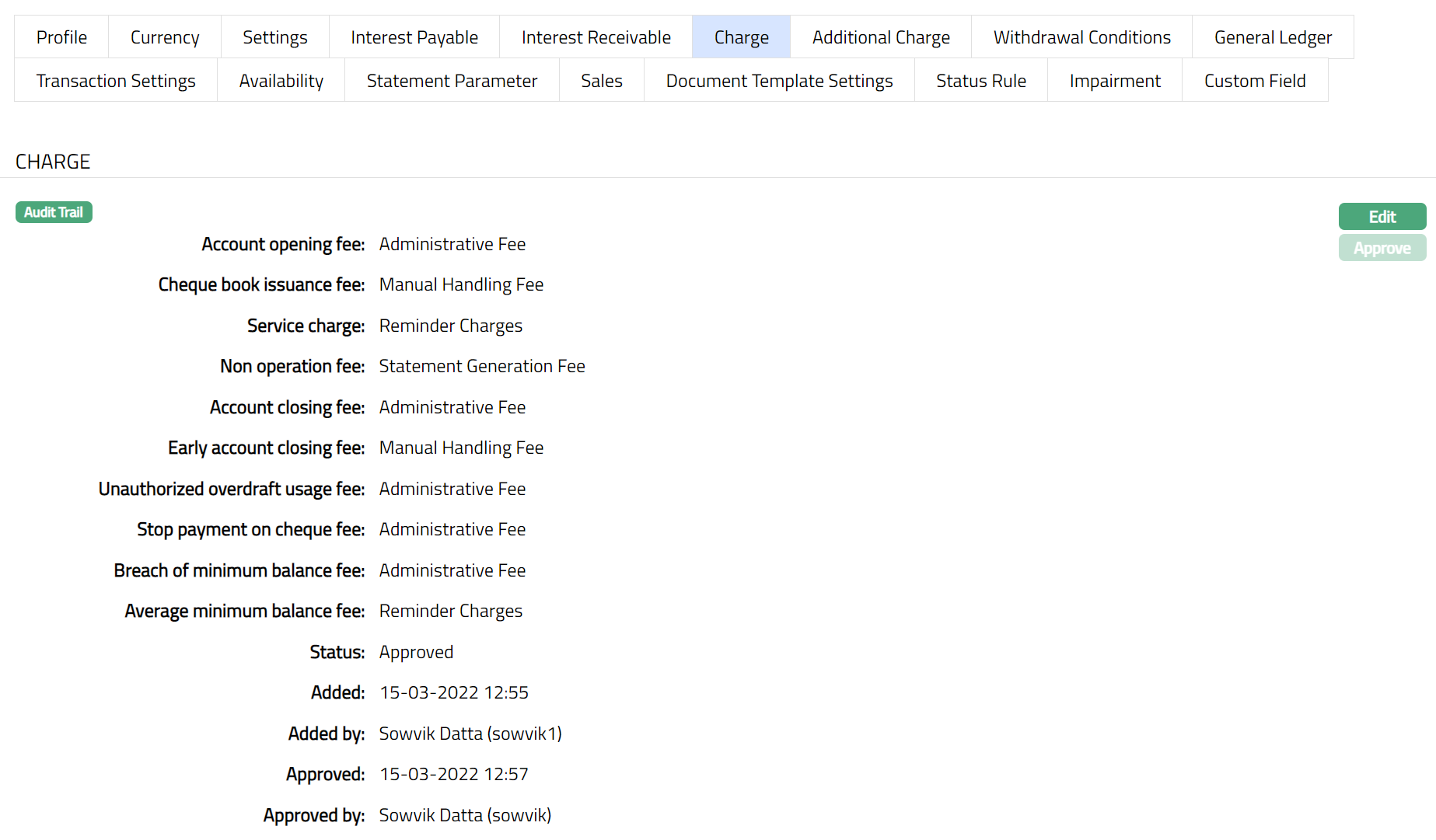 Note: After creation / edit, the tab is in Pending status. To approve, a user different from the one who created / edited has to retrieve the record and click Approve. Once the tab is approved the Status changes to Approved as shown below.