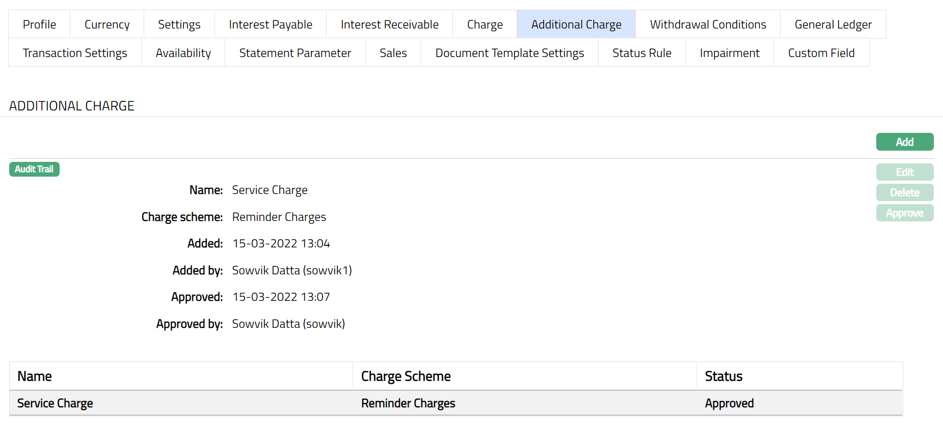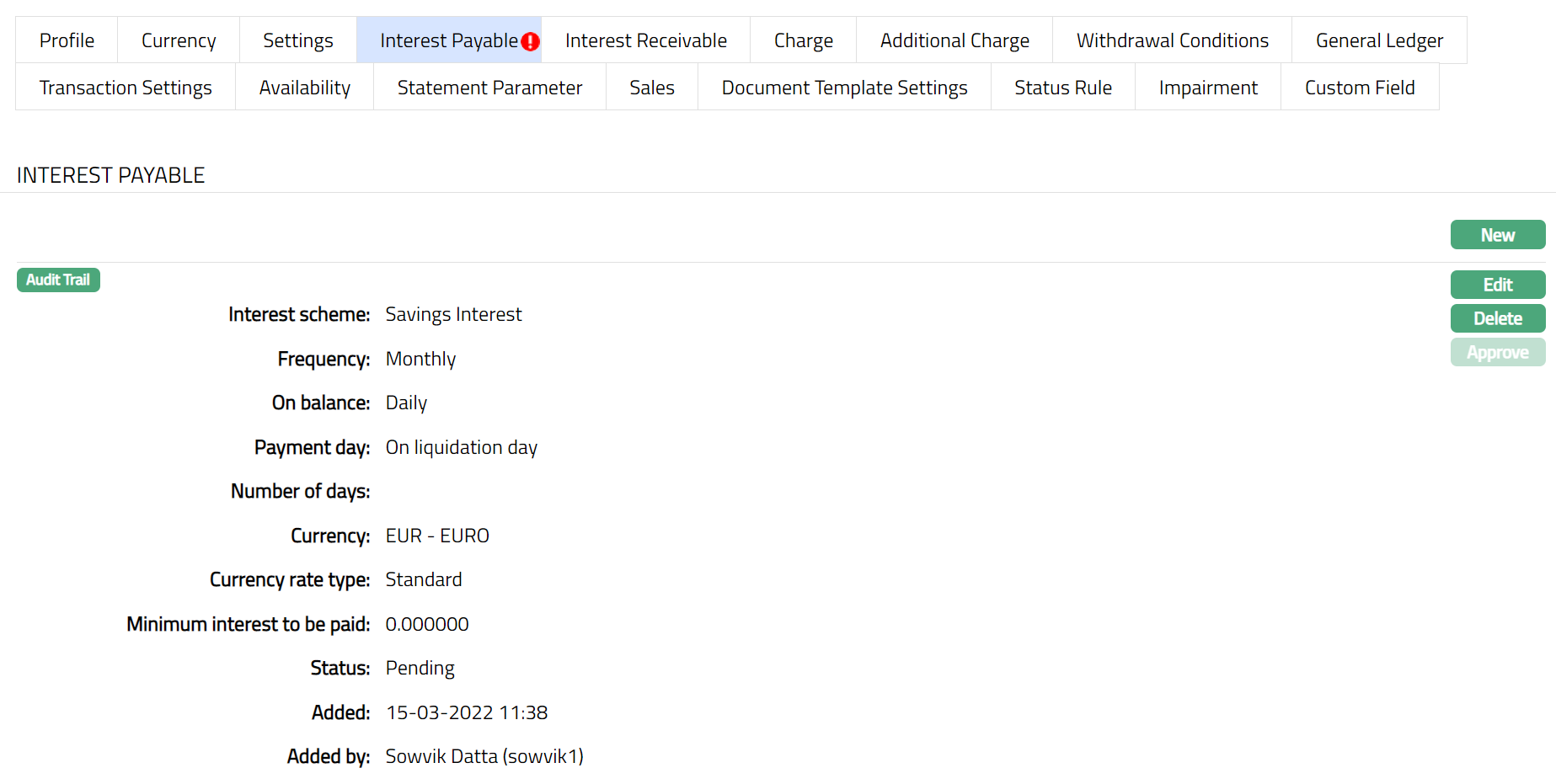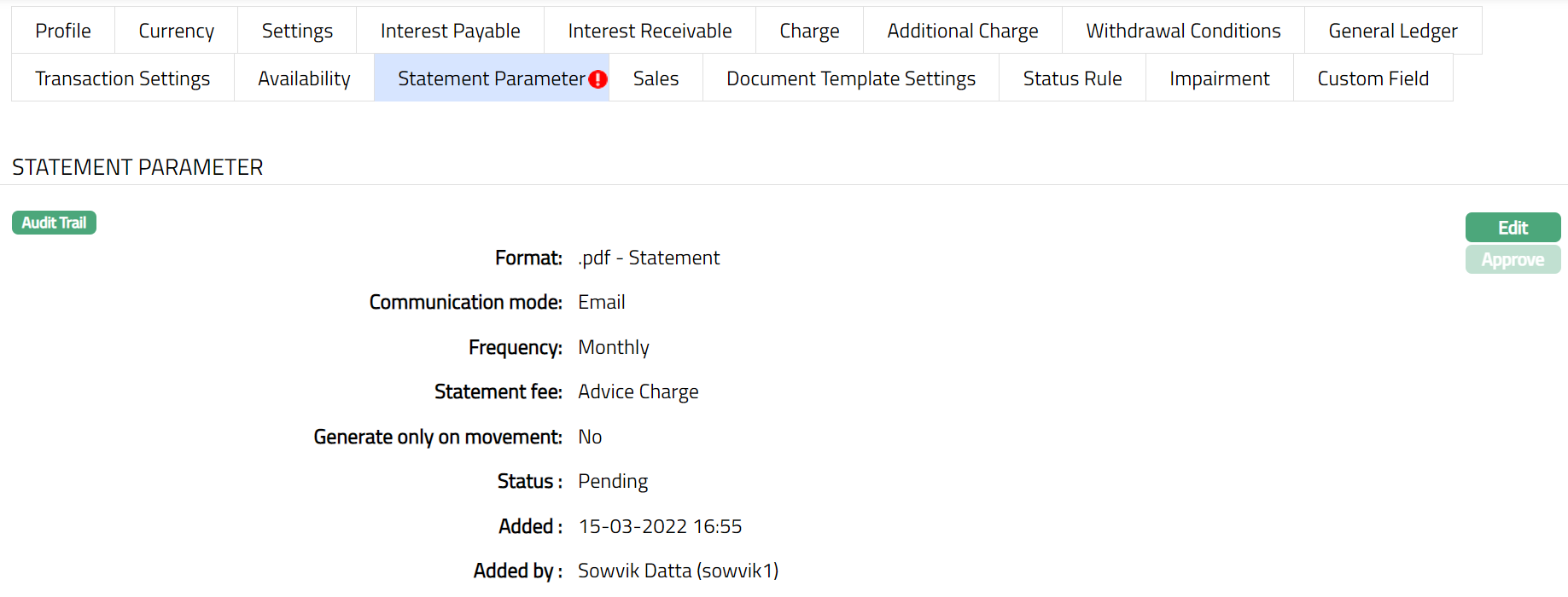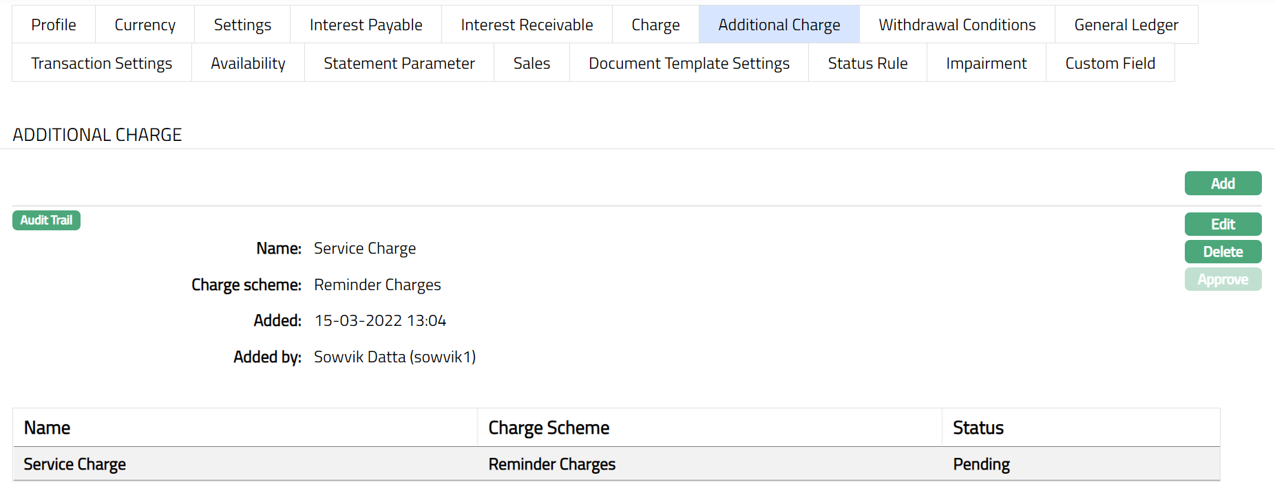 Note: After creation / edit, the tab is in Pending status. To approve, a user different from the one who created / edited has to retrieve the record and click Approve. Once the tab is approved the Status changes to Approved as shown below.