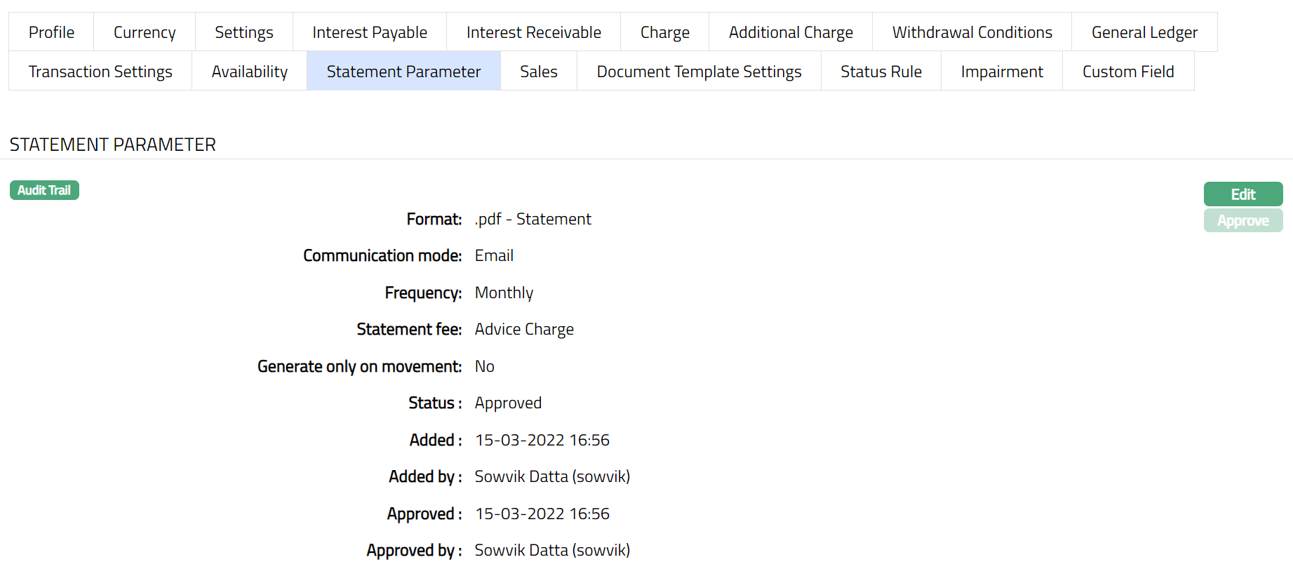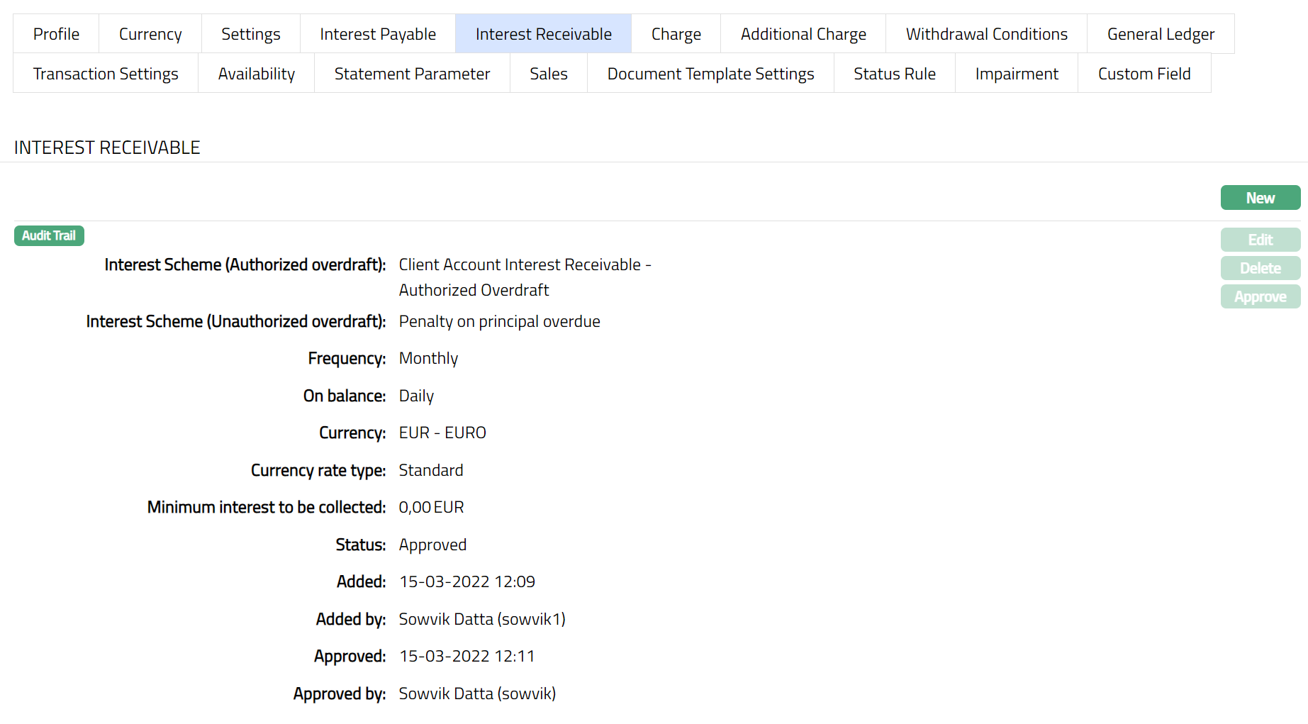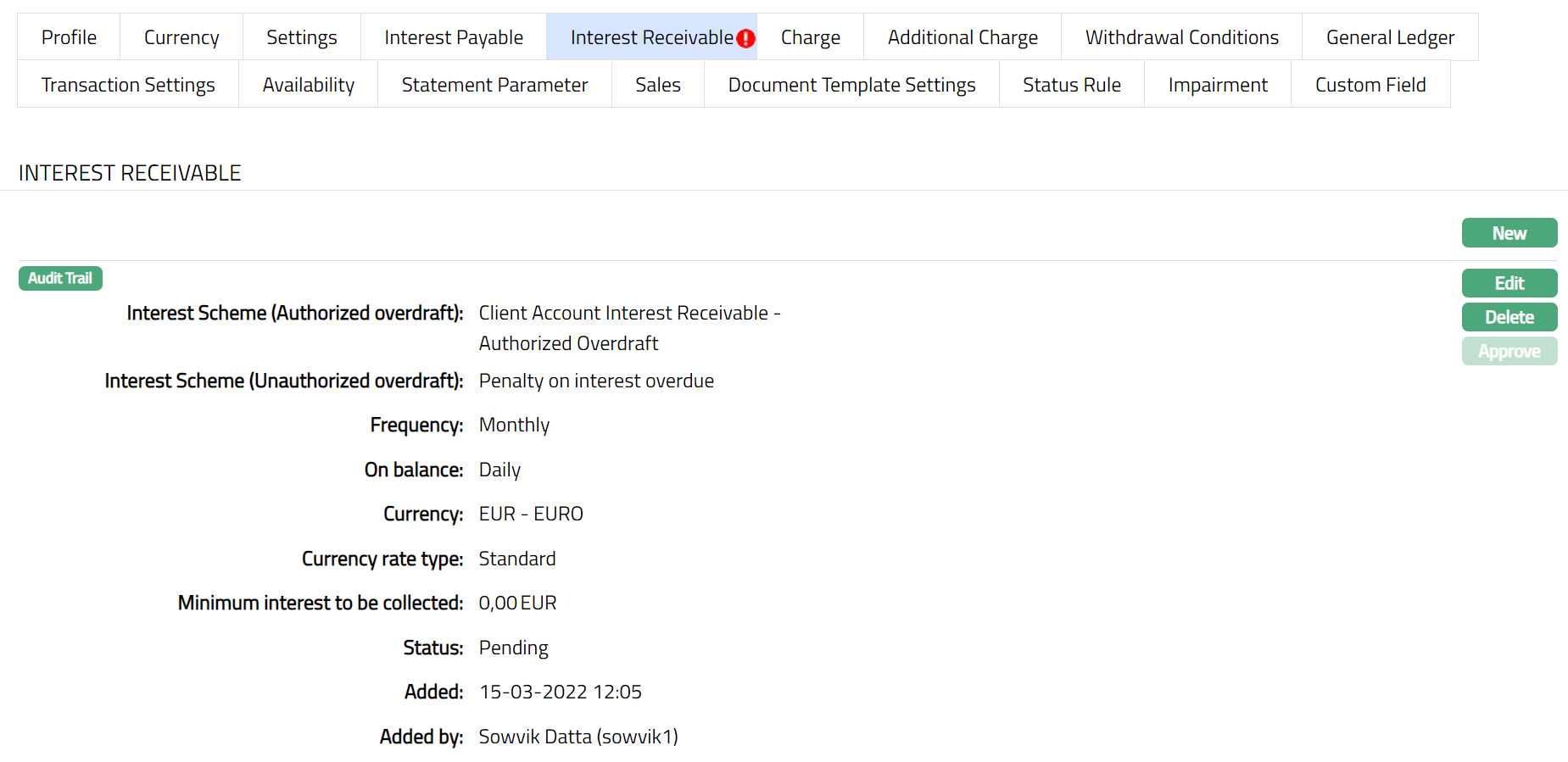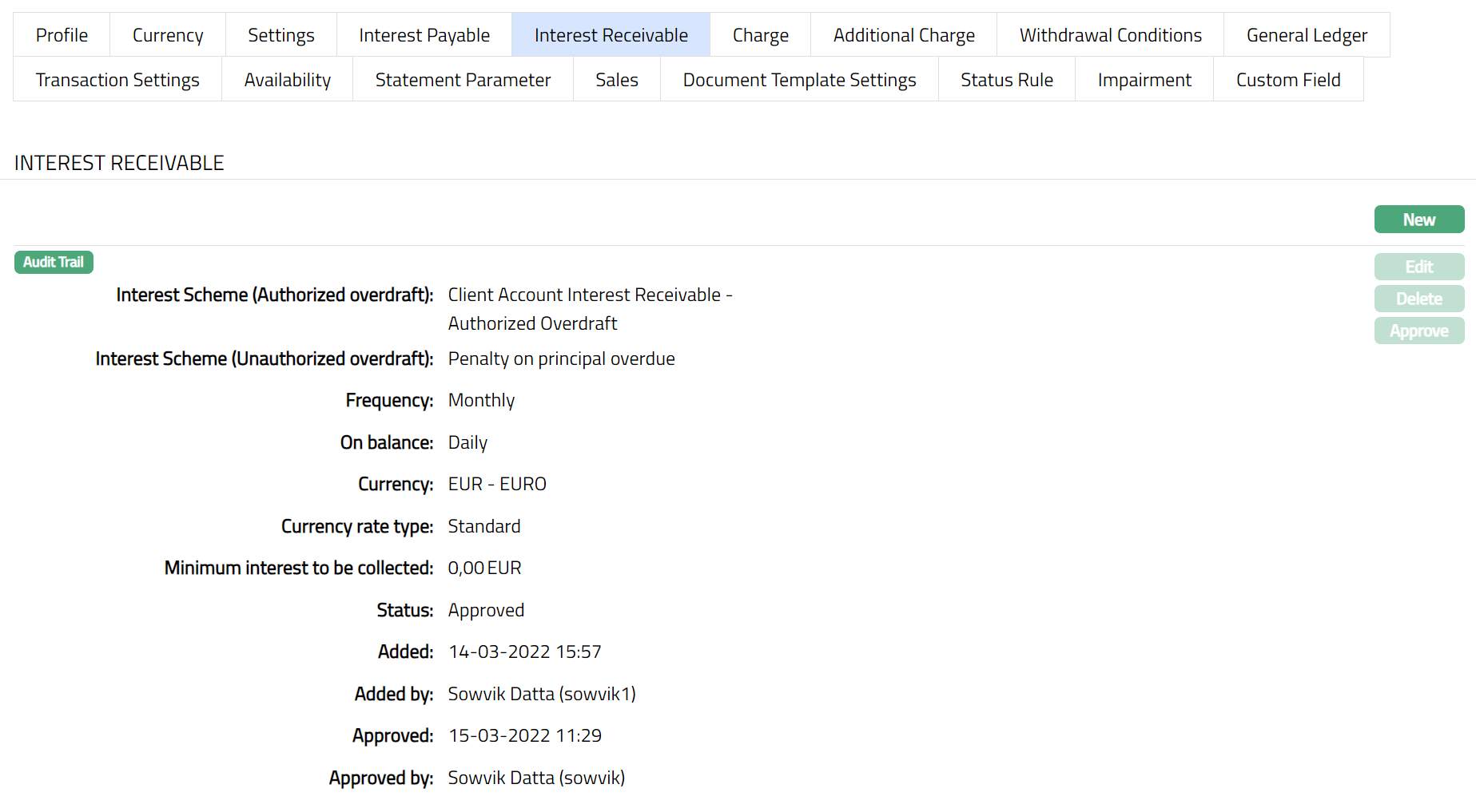 Note: After creation / edit, the tab is in Pending status. To approve, a user different from the one who created / edited has to retrieve the record and click Approve. Once the tab is approved the Status changes to Approved as shown below.