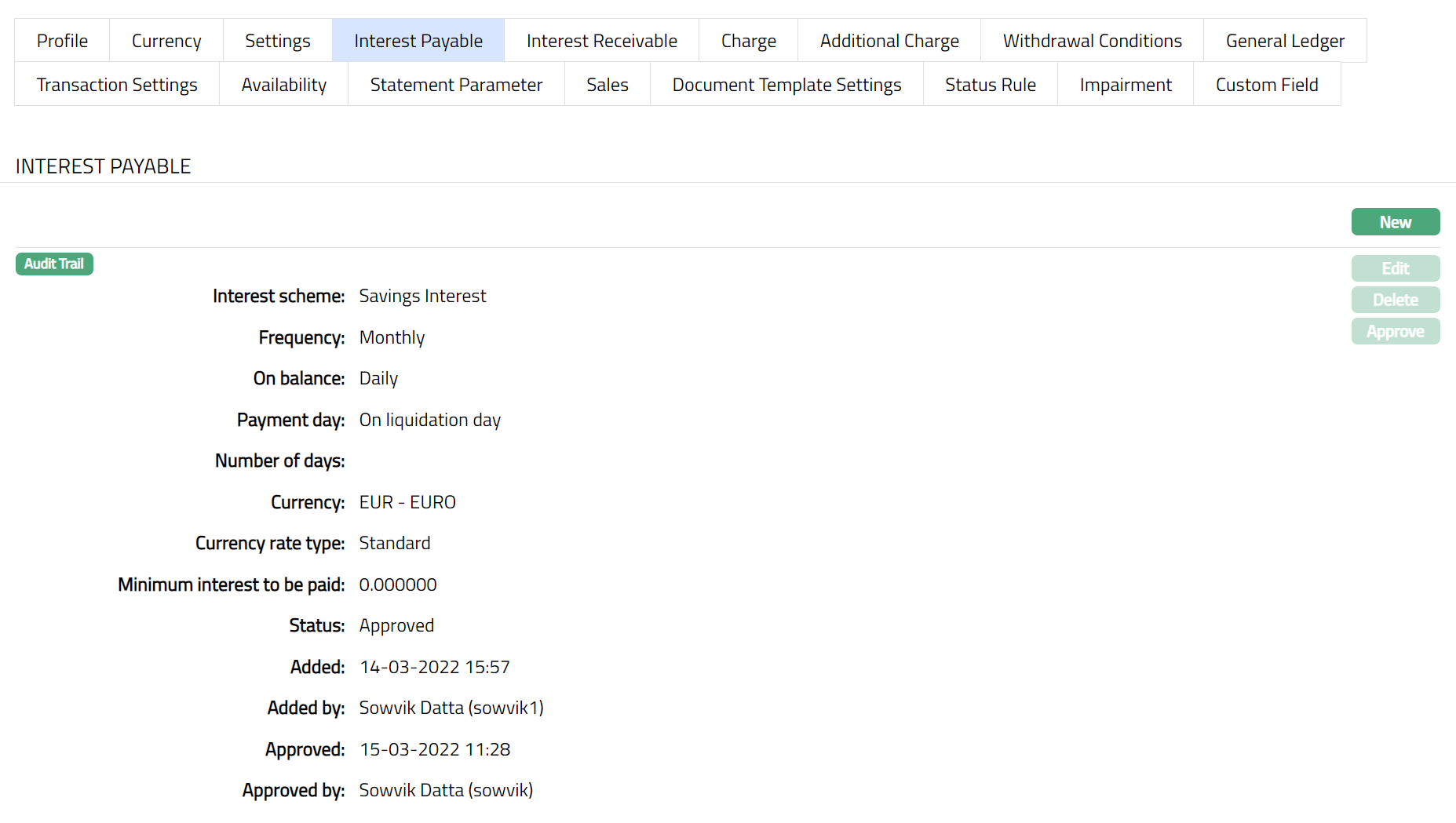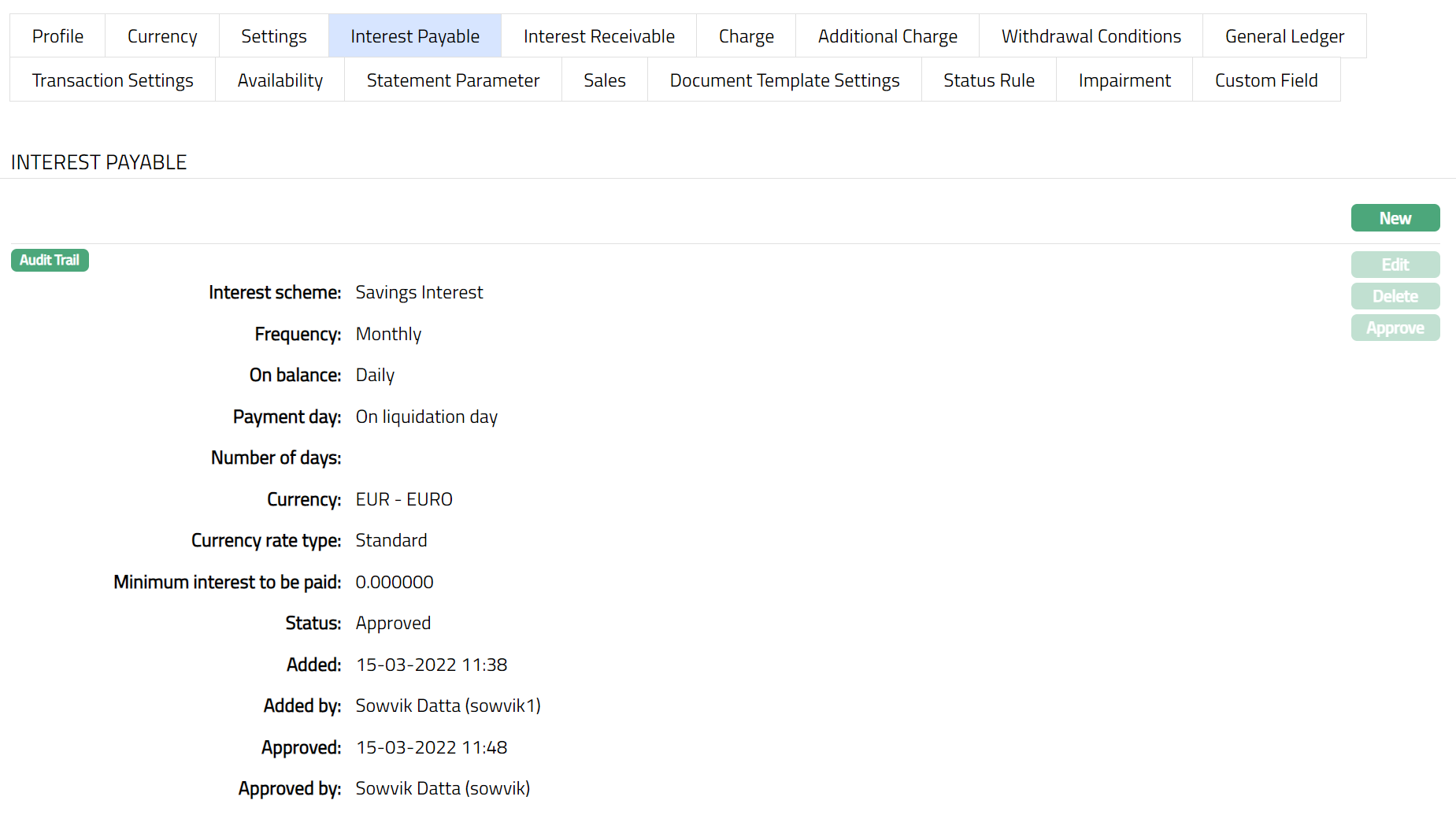 You can specify the balance amount on which the Interest payable is to be accrued using the On balance drop-down list. Available options are: Daily, Period end, Minimum and Average.