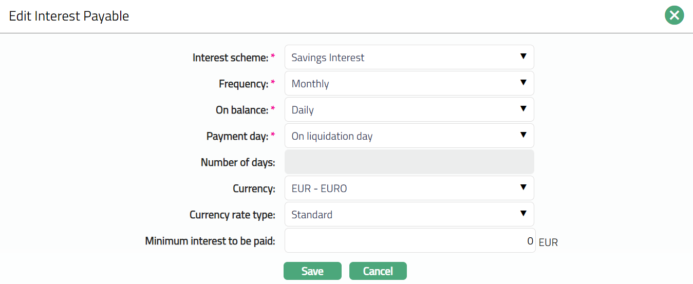 Select the Payment Day for the Interest payable from the drop-down list. The options available are On liquidation day and Liquidation Day + n day. If you select Liquidation Day + n day, then Number Of Days field will be enabled.