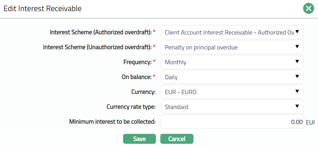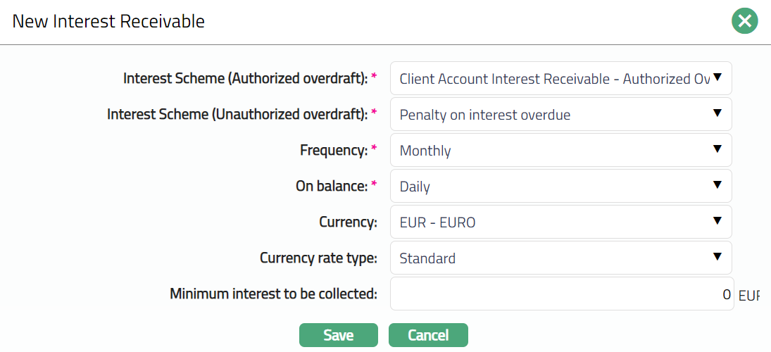 Note: The amount entered in Minimum interest to be collected and Maximum interest to be collected belongs to the currency chosen in Currency field, and the number of decimals will depend on the currency name chosen in Currency field.