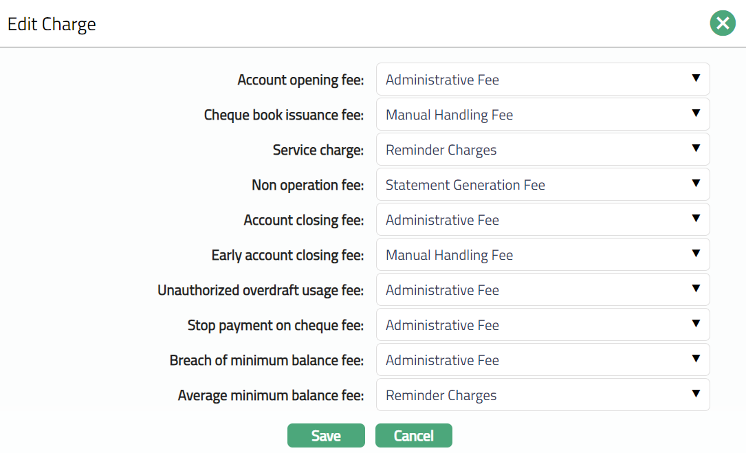 If you want to collect charges for closure of the account, select the Account closing fee from the list of Event based Flat charges for which Treat as receivable is No maintained under Admin > Pricing > Charges > Charge Schemes.