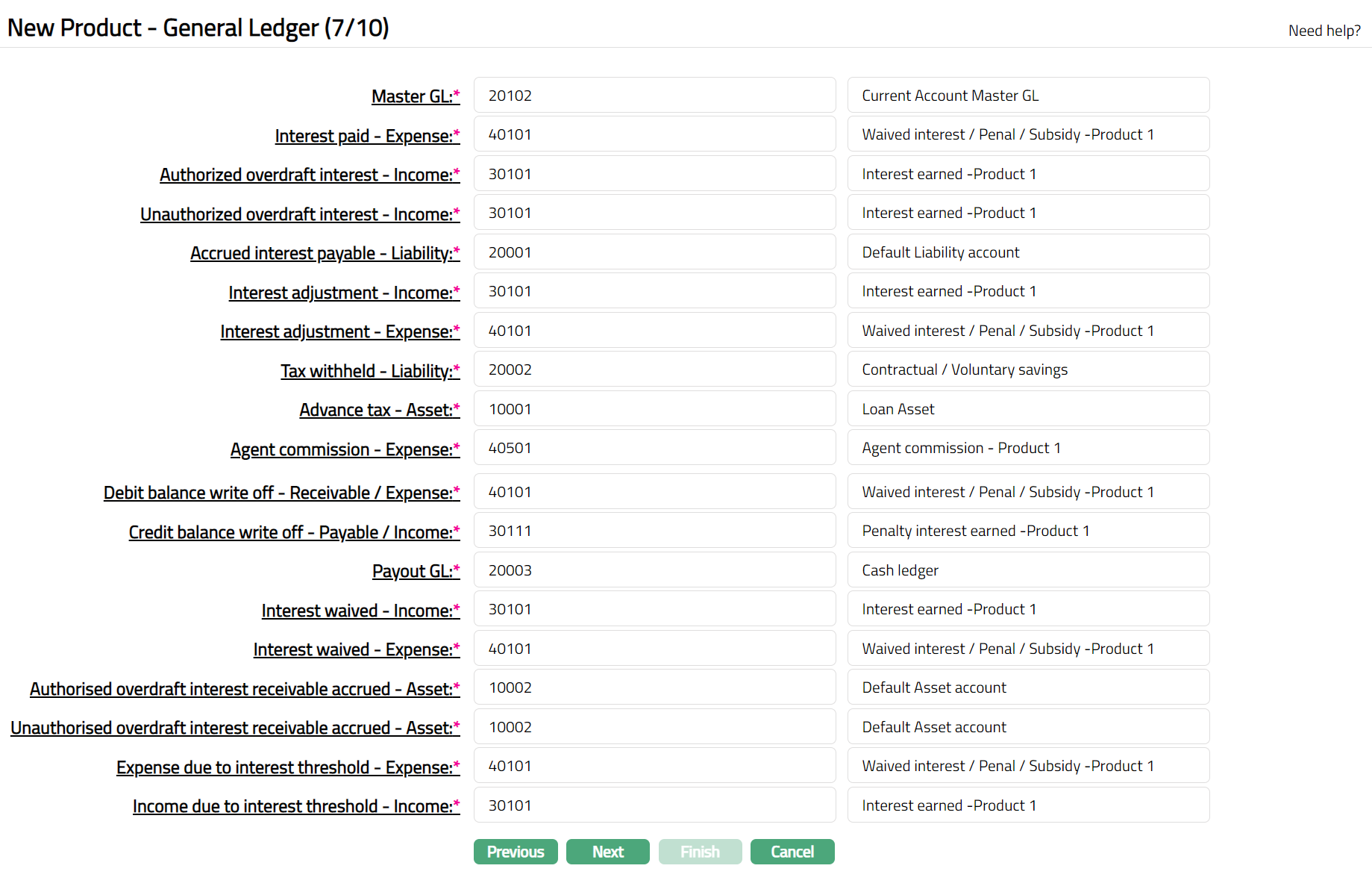 - Click Next. The New Product - General Ledger (7/10) page appears.