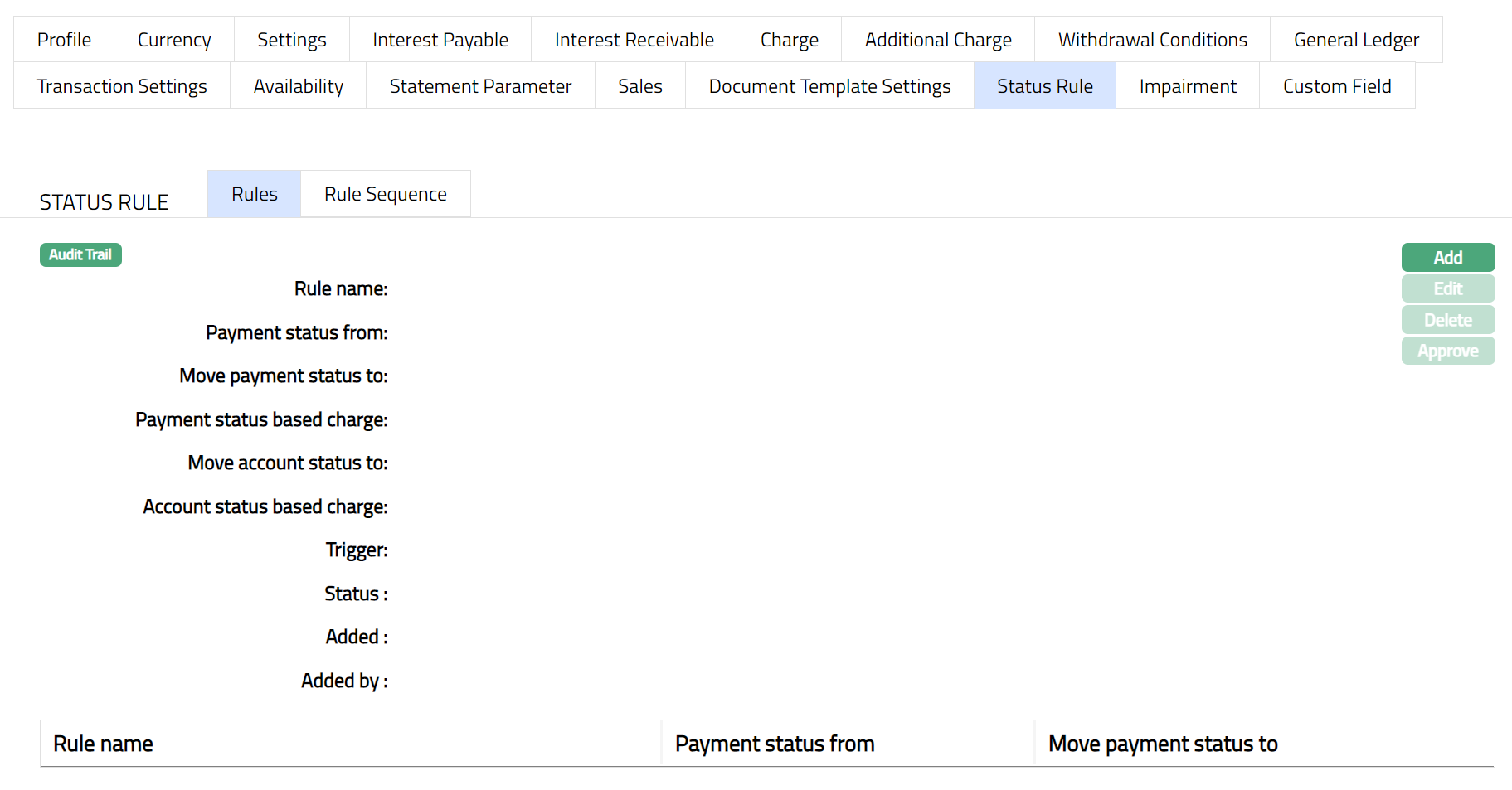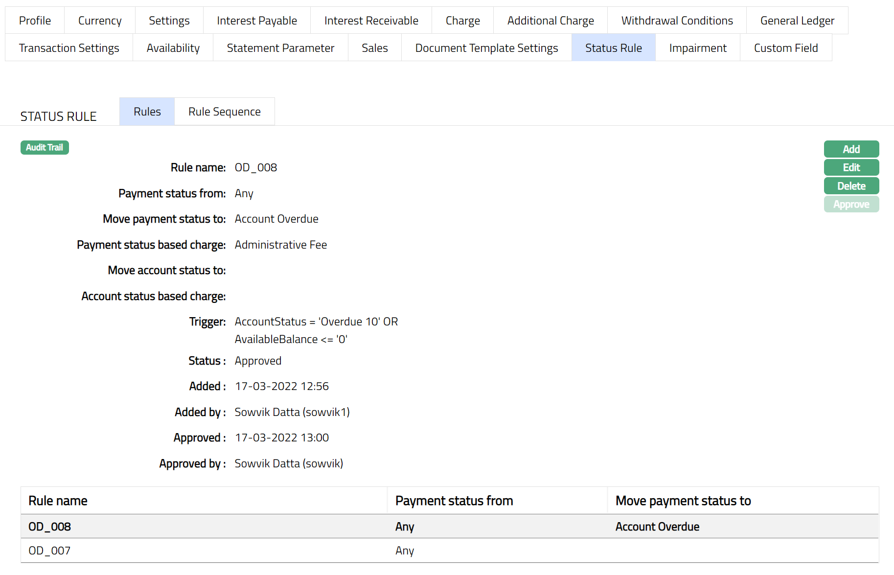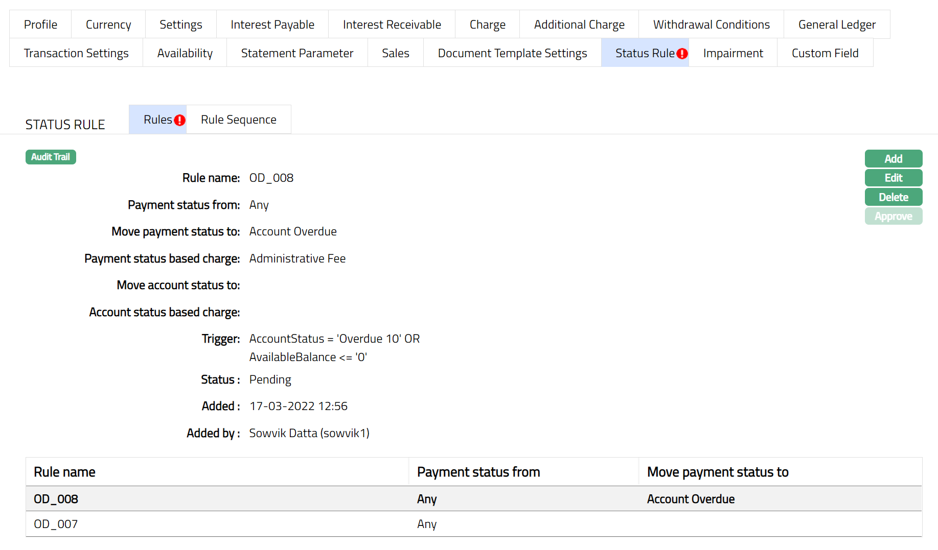 Access Product page. Click Status Rule, and then click Rule Sequence tab.