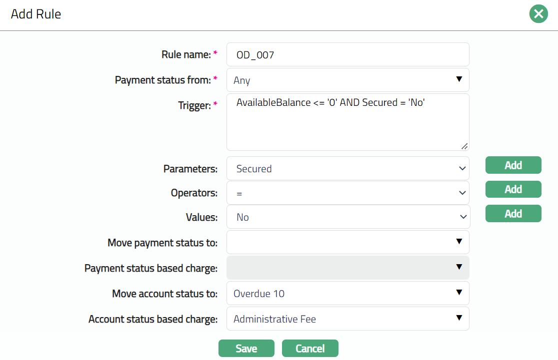 Available Balance: If the Parameter is Available balance, then the value field becomes a text box for you to enter an amount. This parameter is used to move the account status (as specified in the rule) based on the amount available in the account.