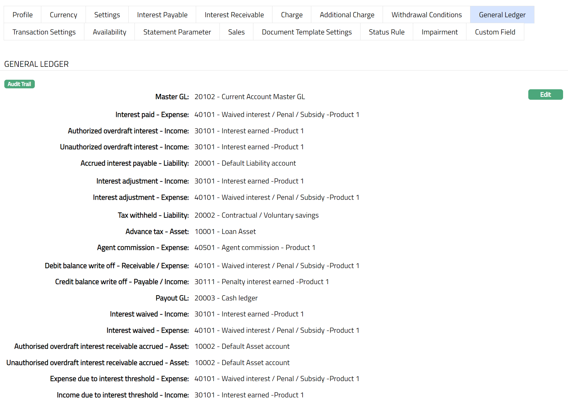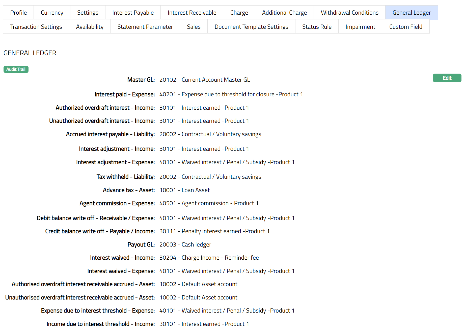 Access Product page. Click General Ledger tab to view the details as per sample below. The details are defaulted from the entries that you made during Product creation. For details refer to Client Account > New Product -- General Ledger (7/10).