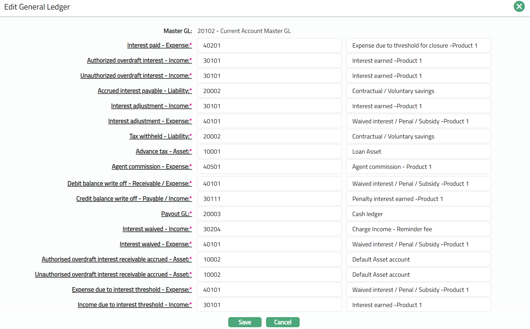 | 11 | Debit Balance write off – Receivable / Expense | for accounting the Debit Balance written off on accounts under this product | ledger type Receivable or Expense |