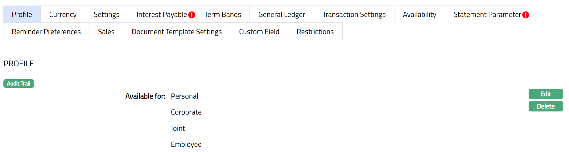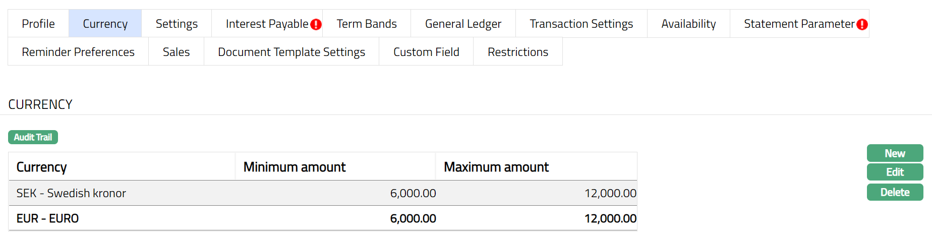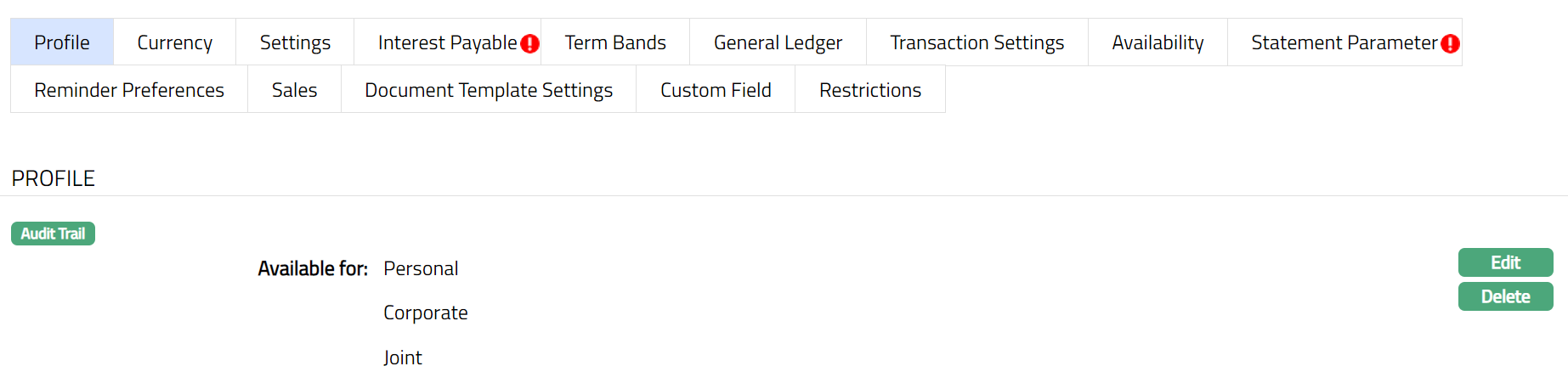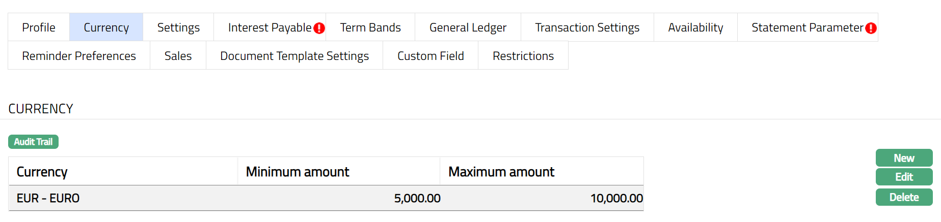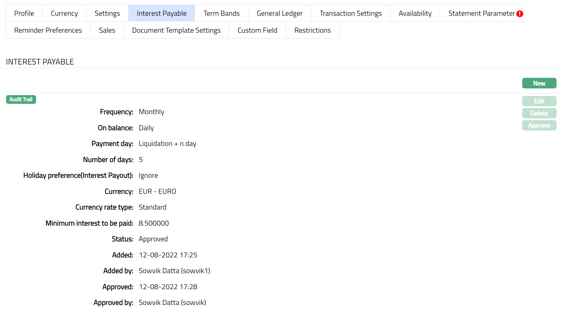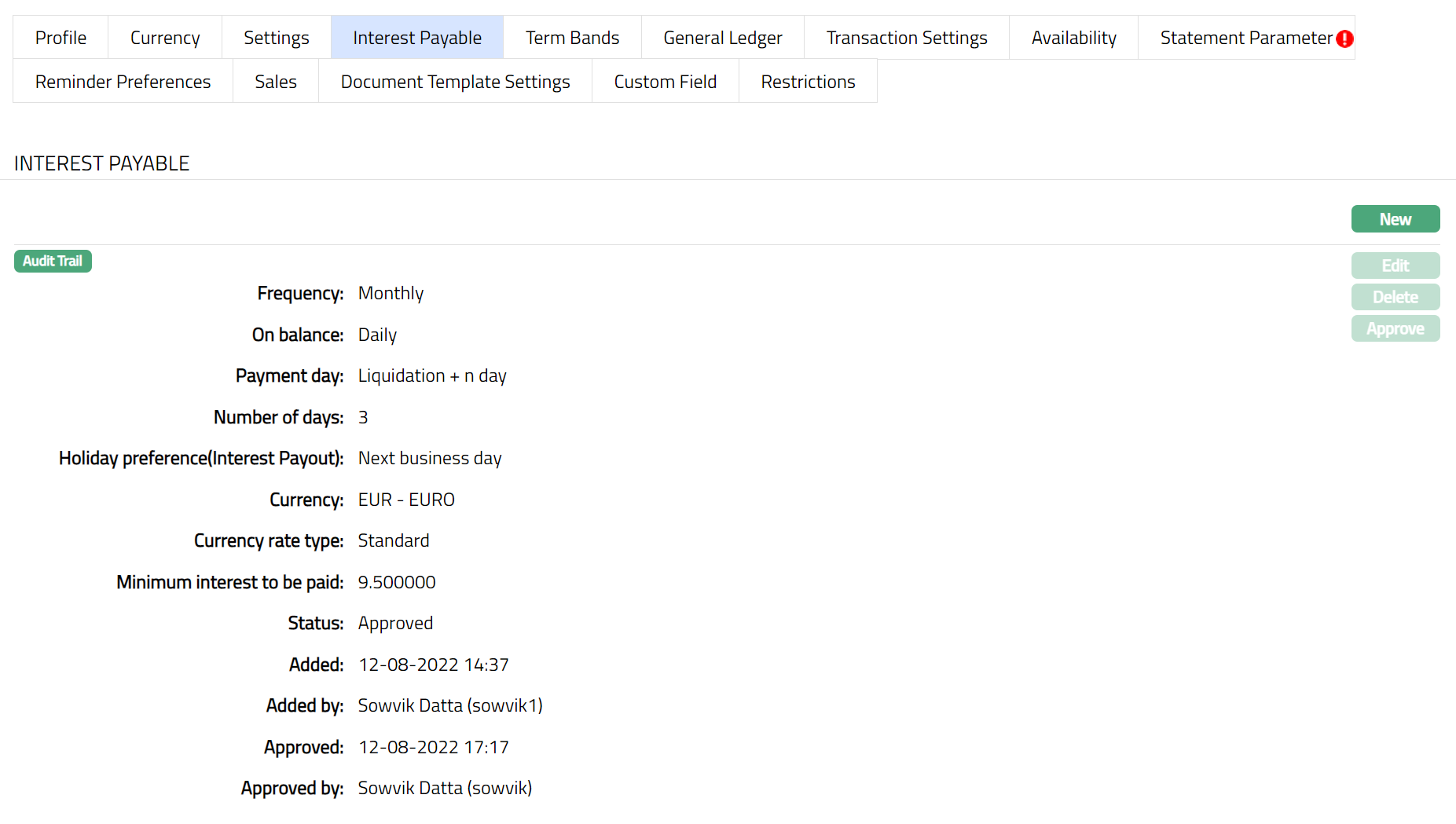 Note: After creation / edit, the tab is in Pending status. To approve, retrieve the record and click Approve. Once the tab is approved, no further changes can be done on the Interest Payable tab. If you want to change any settings for the Product under the Interest payable tab, you have to use the New button.