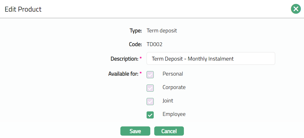 Select Term Deposit as the Type from the drop-down list for the Product.