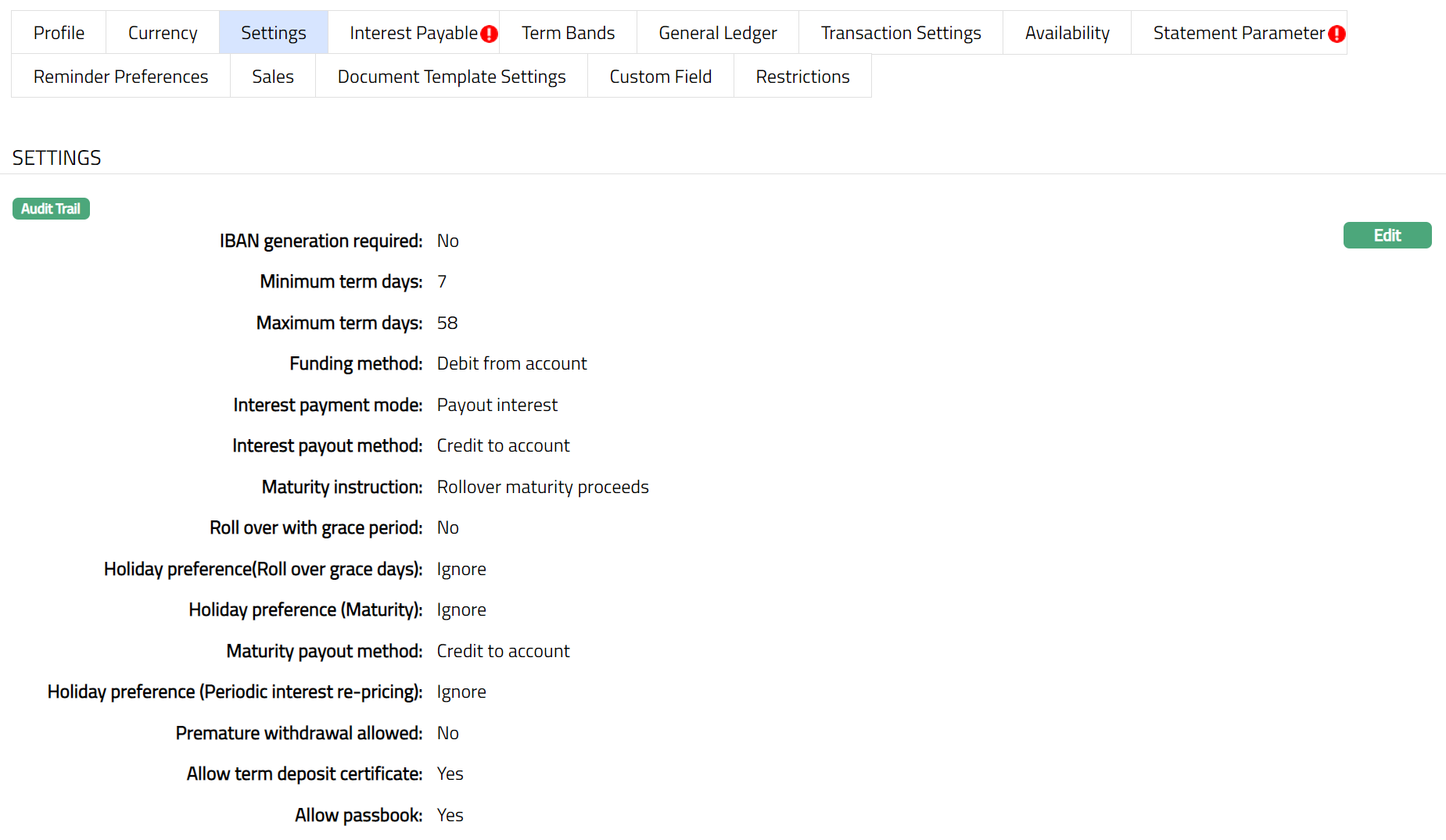 Access Product page. Click Transaction settings tab to view the details as per sample below. The details are defaulted from the entries that you made during Product creation. For details refer to Term Deposit > New Product -- Transaction settings (6/8).