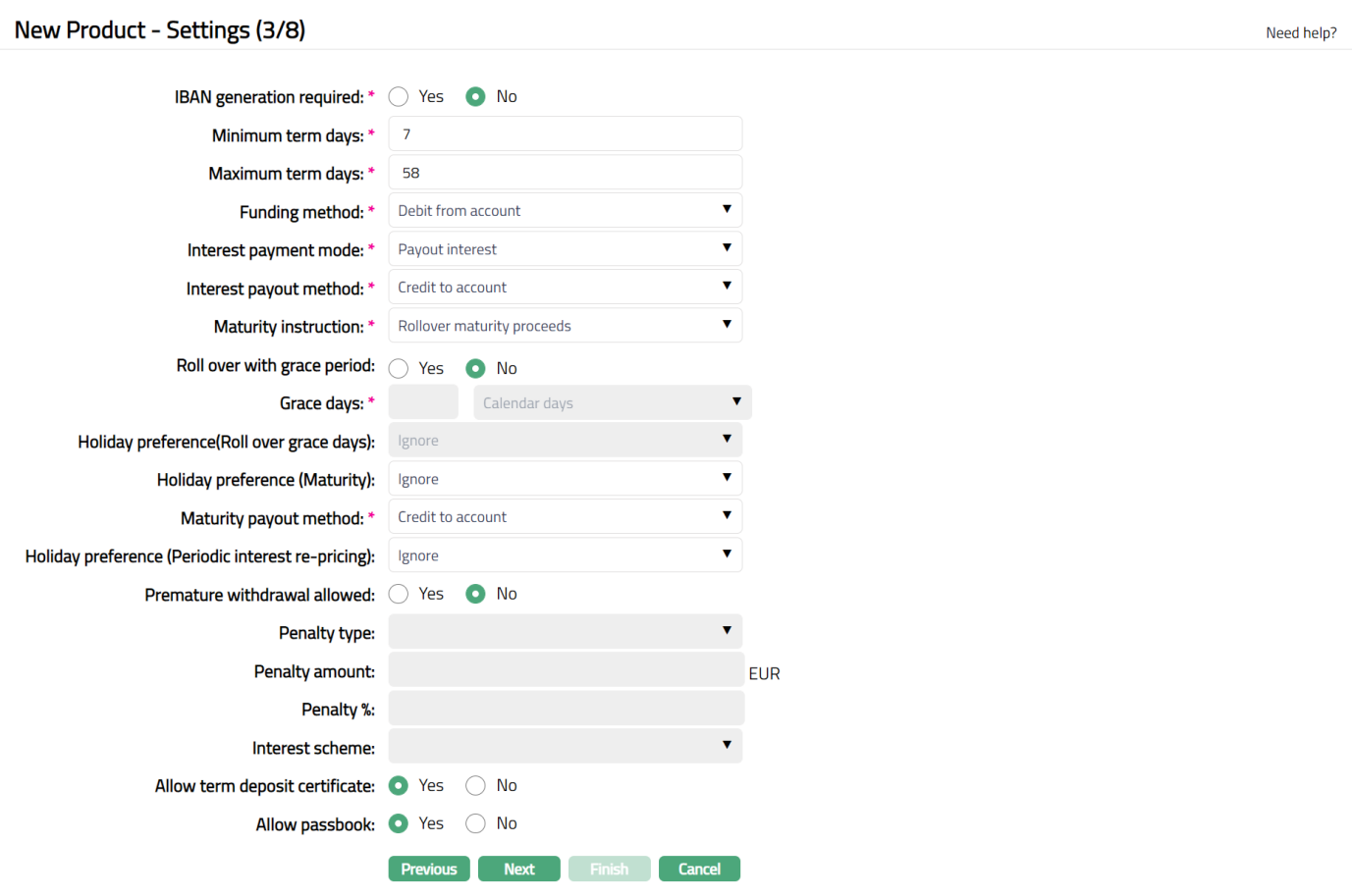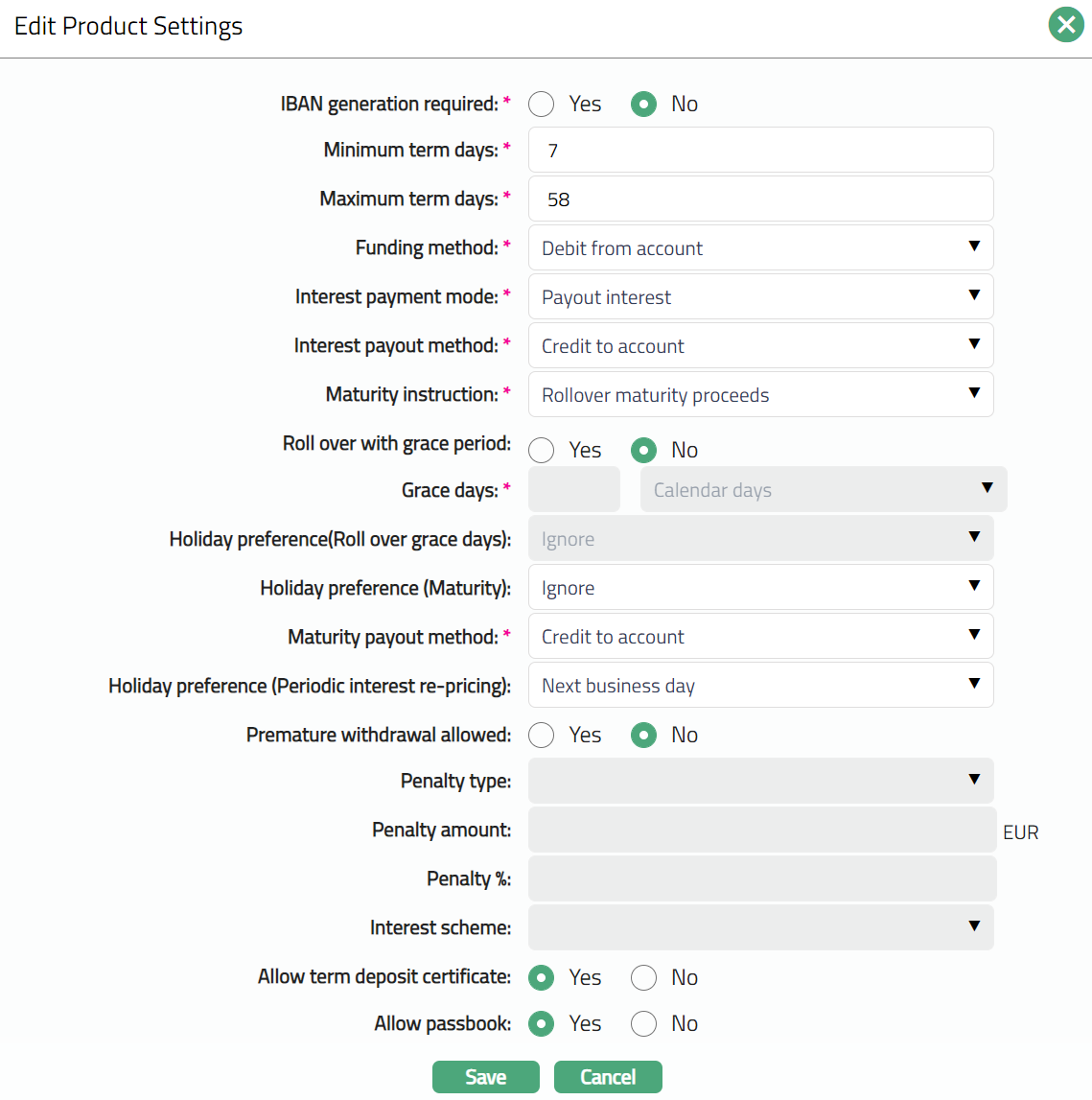 By default, Premature withdrawal allowed is set to No. and hence premature withdrawal is not allowed for the product. If it is set to Yes, then Premature withdrawal will be allowed for the product.