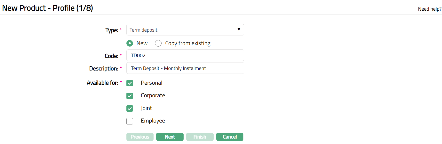 If you want to create a loan product based on the properties of an existing term deposit product, then select Copy from existing.
