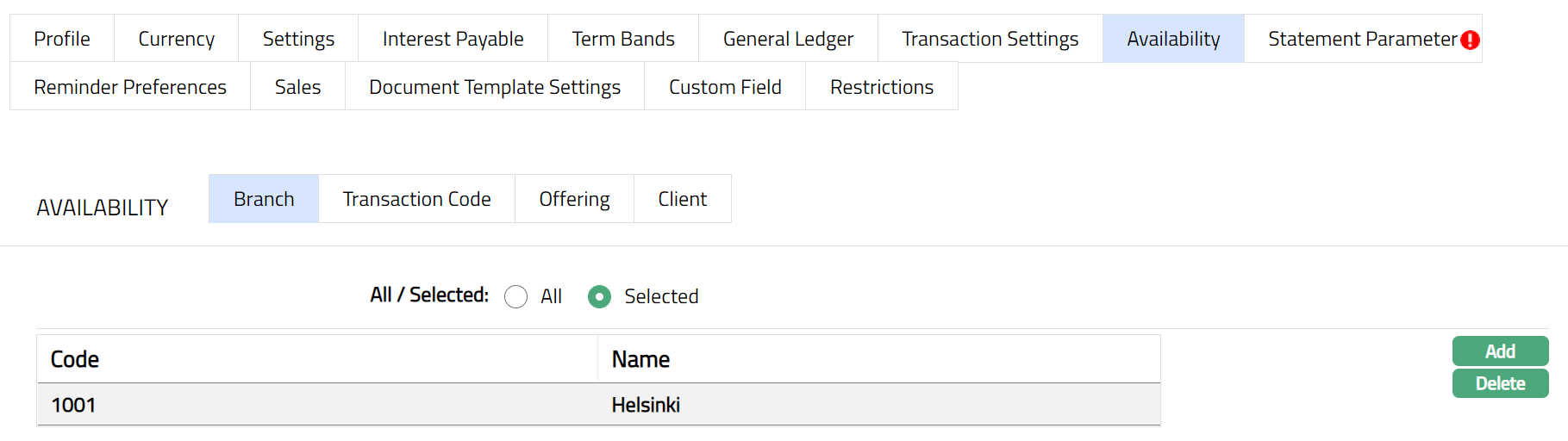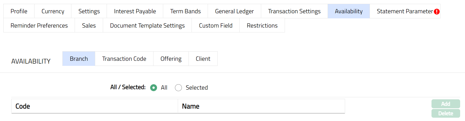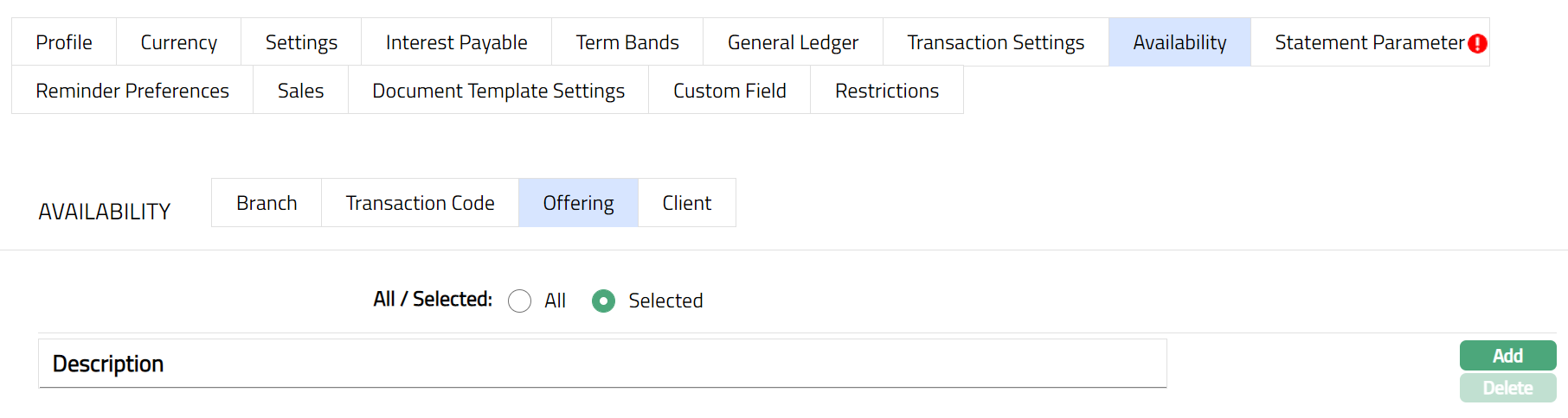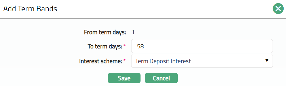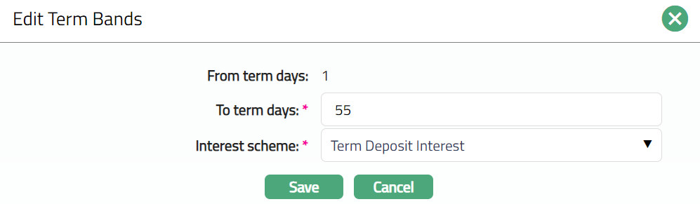 Delete: You can delete Term bands by clicking Delete button. When you click Delete button, Aura displays an alert message. On confirmation Aura will delete the Interest payable. On deletion the deleted Term Bands will not be available at the account level for creation of new accounts.