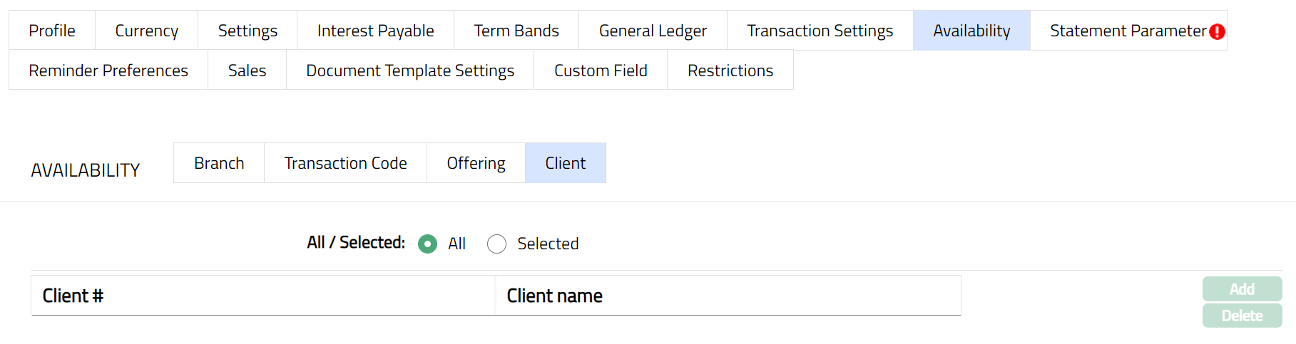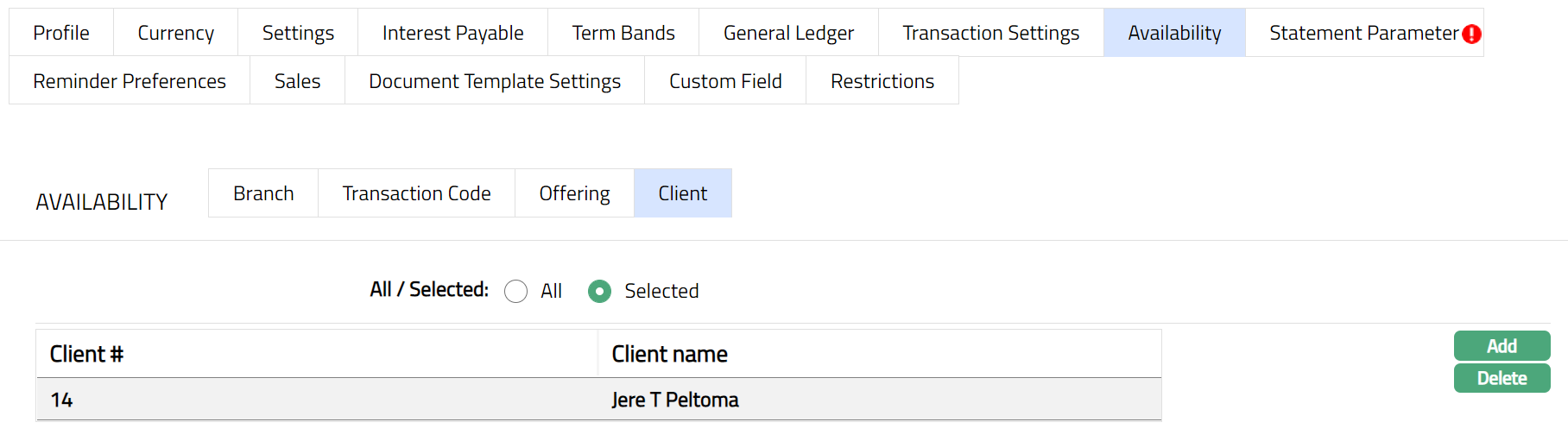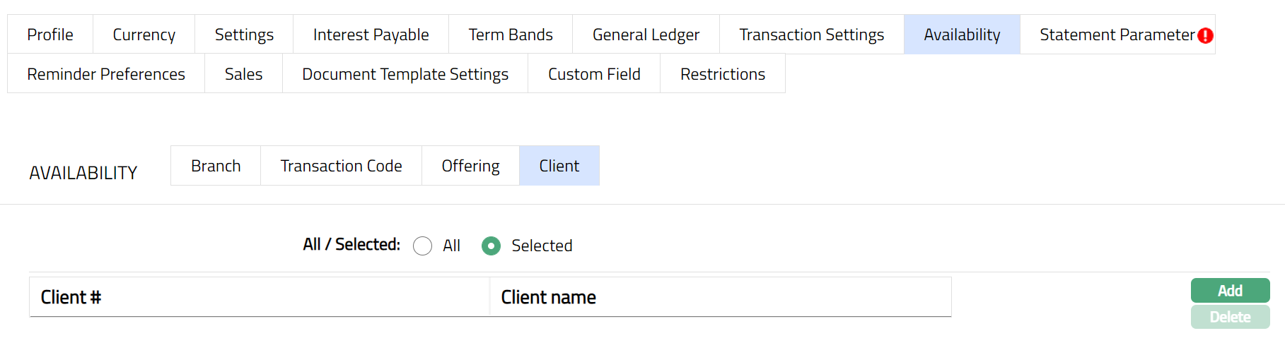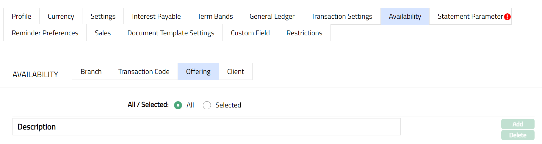Delete: You can delete Term bands by clicking Delete button. When you click Delete button, Aura displays an alert message. On confirmation Aura will delete the Interest payable. On deletion the deleted Term Bands will not be available at the account level for creation of new accounts.