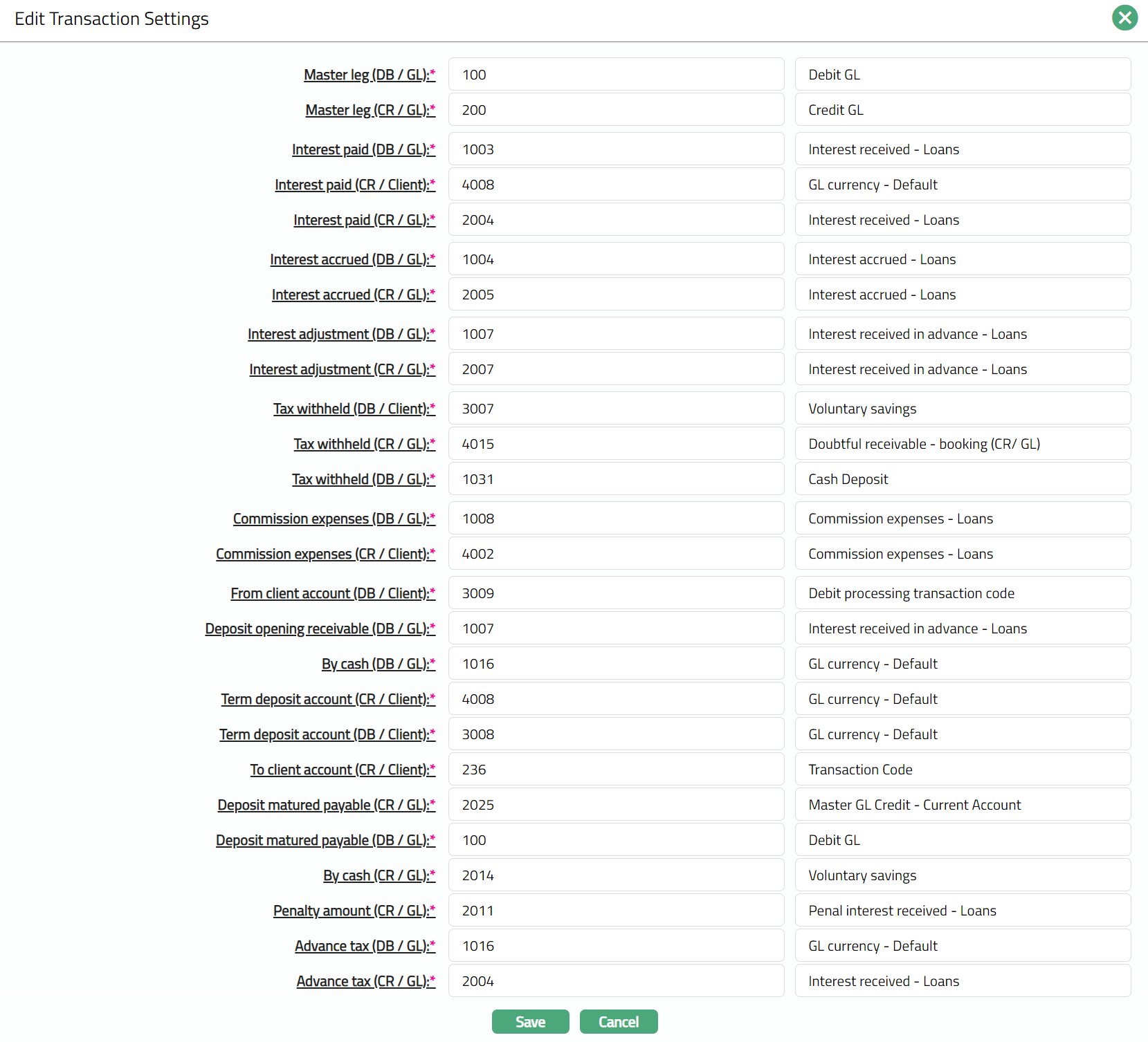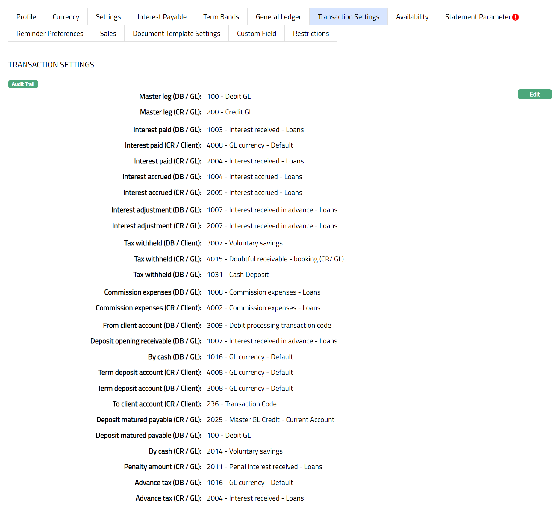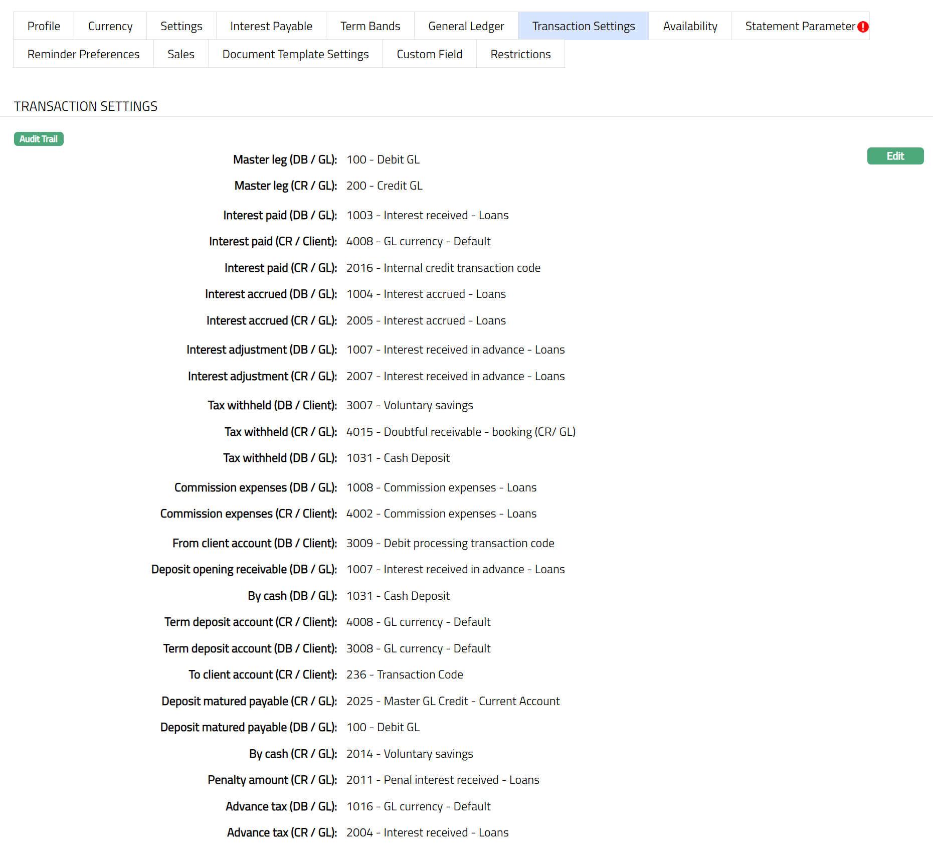 Transaction settings tab allows you to specify the transaction codes that are to be used for the various events in the life cycle of the Product. These transaction codes define what description / narration is used for the account postings / statements and may also be used to trigger other charges.