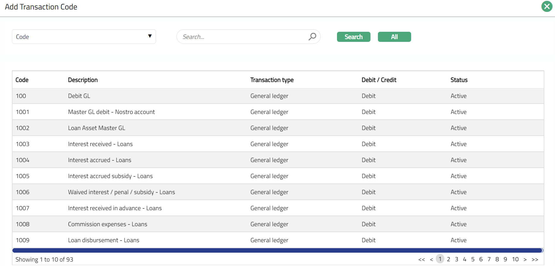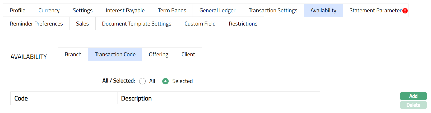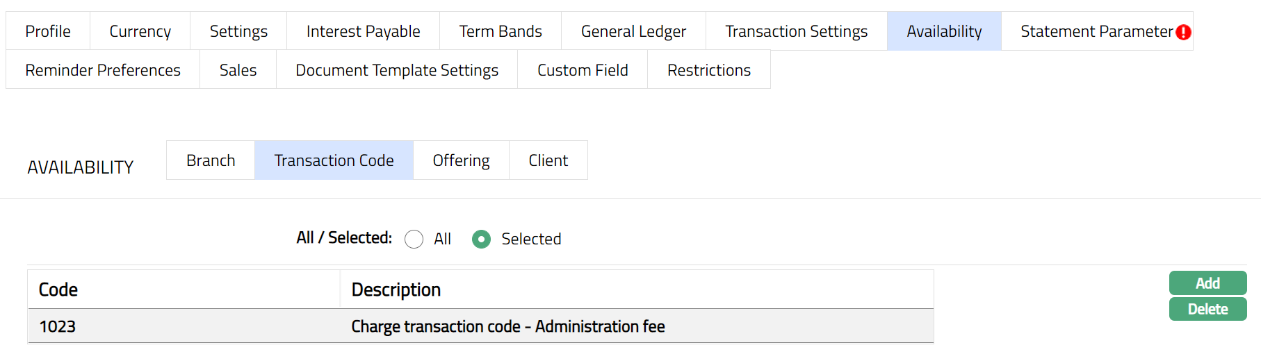 Transaction settings tab allows you to specify the transaction codes that are to be used for the various events in the life cycle of the Product. These transaction codes define what description / narration is used for the account postings / statements and may also be used to trigger other charges.