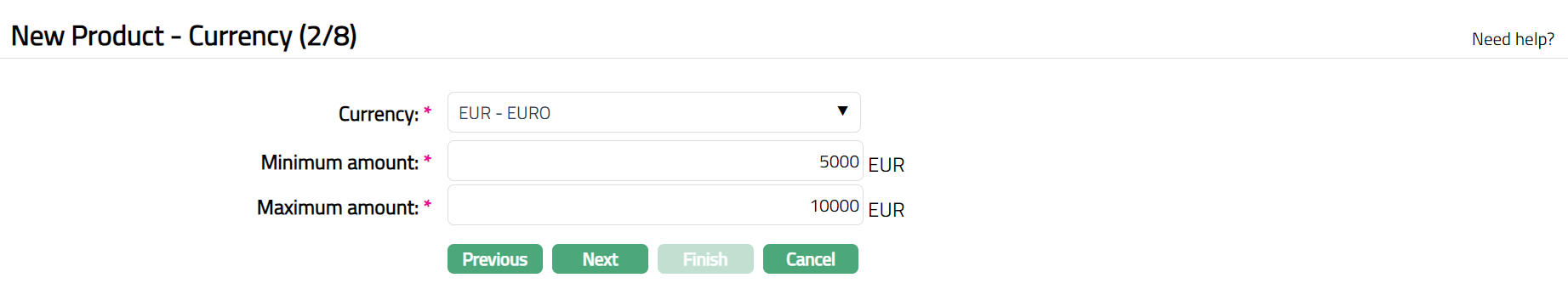 - Click Next. The New Product -- Currency (2/8) page appears.
